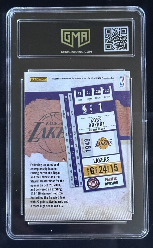 20110-2011 Panini Playoff Contenders Patches Season Ticketz Kobe Bryant #1, GMA 9 Mint Condition. Card ships inside bubble mailer.