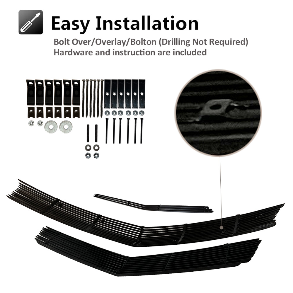This billet grill combo instantly upgrades the front end of my 2012 Camaro SS—the polished silver finish looks aggressive and premium. Installation was tool-free in under 30 minutes; no drilling needed! The aluminum feels sturdy, and the precise fit gives a factory-quality look. Zero complaints after months of driving—still shines like new. Perfect mod for Camaro owners wanting bold style without permanent changes.