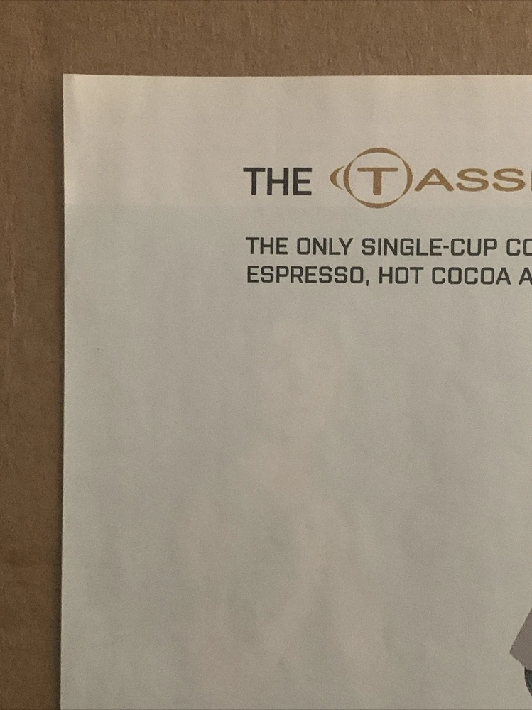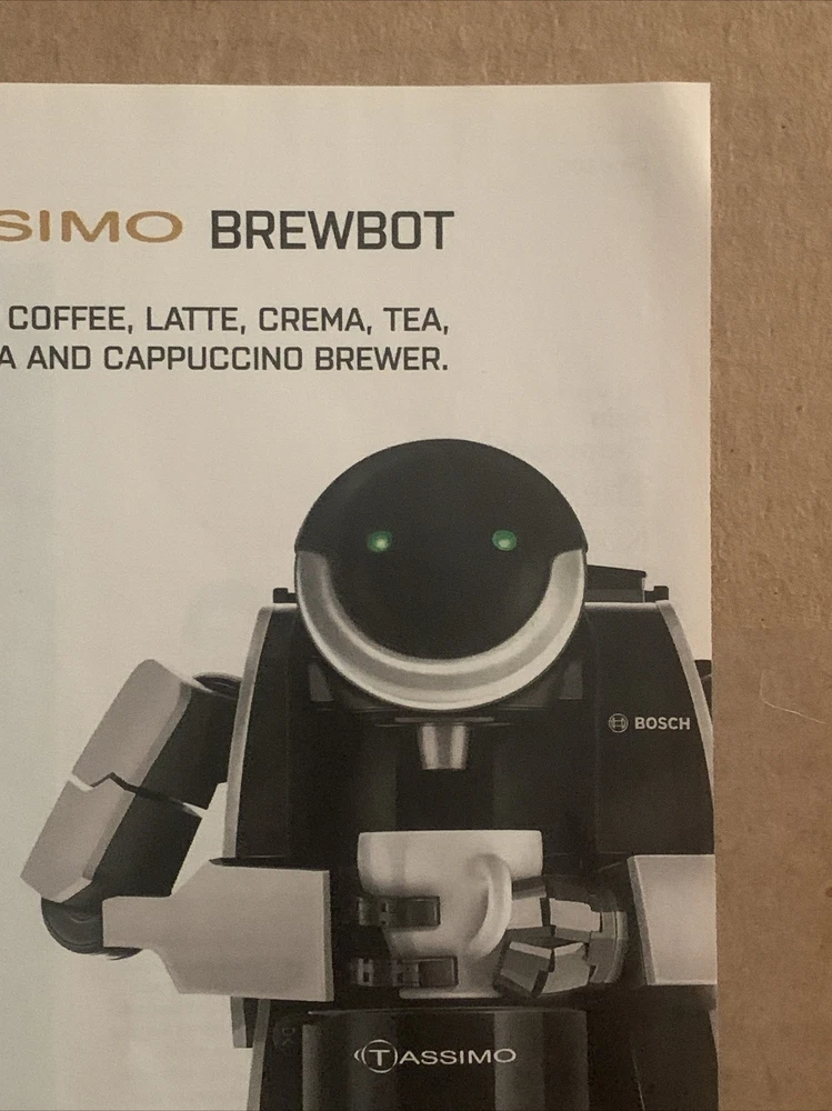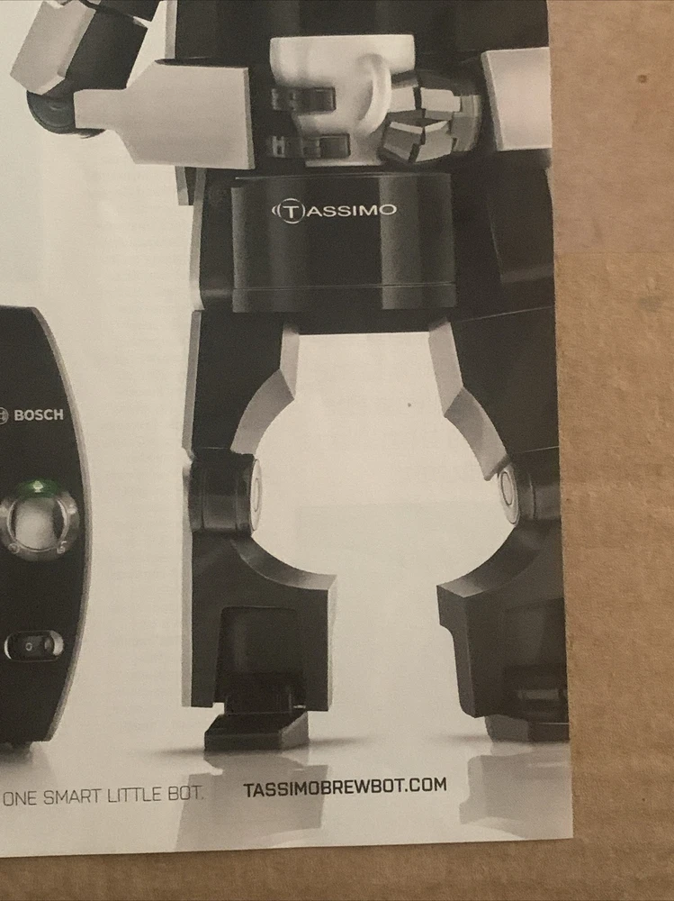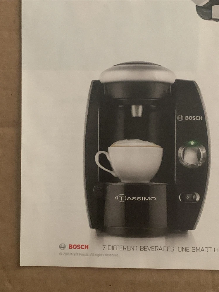 This 2011 Bosch Tassimo Brewbot PRINT AD is a great addition to any collector's archive. The multi-colored magazine print ad features the all-in-one coffee maker and its ability to brew up to 7 different beverages. The ad is from the United States and was created in 2011, making it a unique piece of advertising history. The brand of the ad is Bosch and it falls under the category of Collectibles, Advertising, Merchandise & Memorabilia, and Advertising-lPrint. This type of advertising is perfect for those interested in vintage ads and the history of advertising. Add this piece to your collection today! Original approximate 8”x11” magazine print ad.
