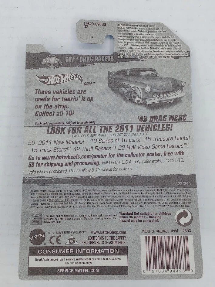 2011 Hot Wheels #122 HW Drag Racers 2/10 '49 DRAG MERC Orange Variant w/Chrome5s SKU#101286 Look closely at the pictures to see further details. We ships USPS PLEASE see photos for detailed condition!! AC PLEASE LOOK AT THE PHOTOS CAREFULLY BEFORE PURCHASING!! If you are purchasing more than one item from us and would like combined shipping, PLEASE request an adjusted invoice from us while still in the cart and BEFORE paying. eBay does not usually calculate combined shipping accurately and you might get overcharged. Please be aware that when we photograph items, we use lighting that will show the details well. Although we try to present the product as accurately as possible, the lighting may affect the overall look of the item by appearing lighter/darker or possibly a different hue than the actual item. Depending on the type of lighting you have in your home, there may be some differences between the photos and the actual item. If this is a concern of yours, please feel free to request additional photos made in natural lighting or ask for a more detailed description of the item PRIOR TO PURCHASE! PLEASE NOTE: We greatly appreciate your interest in our item for sale. We look forward to a pleasant, quick and satisfying transaction for everybody, so please note the following information before bidding. Thank you! ITEM DESCRIPTIONS: * We will try to describe items well and provide plenty of photos. Please review these carefully before bidding or purchasing. * Only the items pictured and described are what you will receive when purchased. * We will occasionally offer an item clearly marked "AS-IS". This means that we are not sure if it works because we are unable to test it for whatever reason. We will offer these at a discounted price then a similar "working" item. It is possible that these items will work fine, but it also is possible that these items are more useful for their parts. Please only bid on or purchase these items if you are well aware of this, as we will only provide refunds of actual item price (no shipping cost refunds) for these items. * If you have any questions that aren't addressed by the descriptions or photos, please feel free to ask before you bid. * May need detailed cleaning SHIPPING: * We usually do not offer shipping to international addresses, but ARE WILLING TO TAKE CONSIDERATIONS. * We try to pack items as carefully as possible, but damage may occur during shipping. If you receive an item that was damaged in shipping, please contact us and we will work with you to resolve the problem. * We will combine shipping costs for all items the same buyer purchases from us within 2 days. Please wait to pay for items until you're done shopping with us. Please contact us if you're expecting to buy more items from us, or to have us adjust the shipping costs. * We will usually ship items out within 24 hours of payment being received Sunday through Friday at noon. We will notify the buyer if there will be a delay in shipping for some reason. Please allow additional time for holidays and weekends when the post office is closed. If payment is received after noon (EST) on Friday, the item might not be shipped until the following Monday. * We do try to recycle shipping materials as much as possible. RETURNS: We abide by eBay's Money Back Guarantee. We definitely want our customers to be happy with their purchase! You may return an item within 30 days of receiving it with the following guidelines: * If the item is defective or damaged (unless we clearly marked the listing "AS-IS"), the buyer will receive a full refund after the buyer returns it and it is received by us. Customers who falsely claim their item is defective, damaged, or not as described in order to receive a full refund and free return shipping will be permanently blocked from making future purchases from us. * If the item is as described (including "AS-IS" items) and the buyer decides for any other reason than defective/damaged to return it, only the actual price of the item will be refunded once it has been returned and it is received by us. The buyer will be asked to pay all original and return shipping charges. This includes all reasons other than defective/damaged, including wrong size, wrong type, changed mind, etc. All "AS-IS" items will fall into this category of return. Please make sure the item is what you want before purchasing it. * Please contact us before initiating a refund request. FEEDBACK: We always leave feedback at the end of transaction. We consider the transaction to be over when we receive feedback from the buyer confirming the item arrived satisfactorily. If you are unsatisfied with your purchase please contact us before leaving neutral or negative feedback. WE APPRECIATE POSITIVE FEEDBACK IF YOU ARE SATISFIED WITH YOUR PURCHASE! THANK YOU FOR YOUR INTEREST IN THIS ITEM!