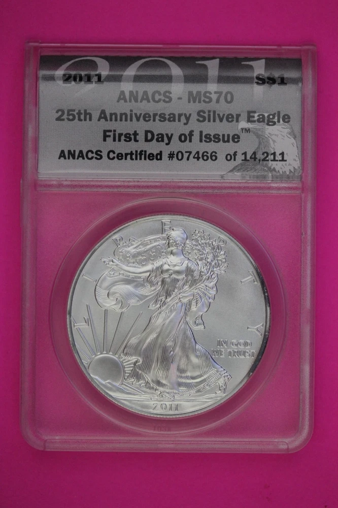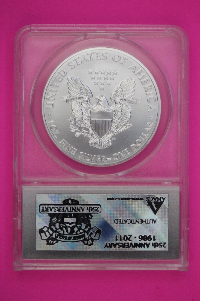 Total Precious Metal Content: 1 Troy Ounce Year: 2011 Coin: American Eagle Composition: Silver Certification: ANACS Brand: US Mint Country/Region of Manufacture: United States Grade: MS 70 Strike Type: Satin Shape: Coin Brand/Mint: U.S. Mint Precious Metal Content per Unit: 1 oz Fineness: 0.999