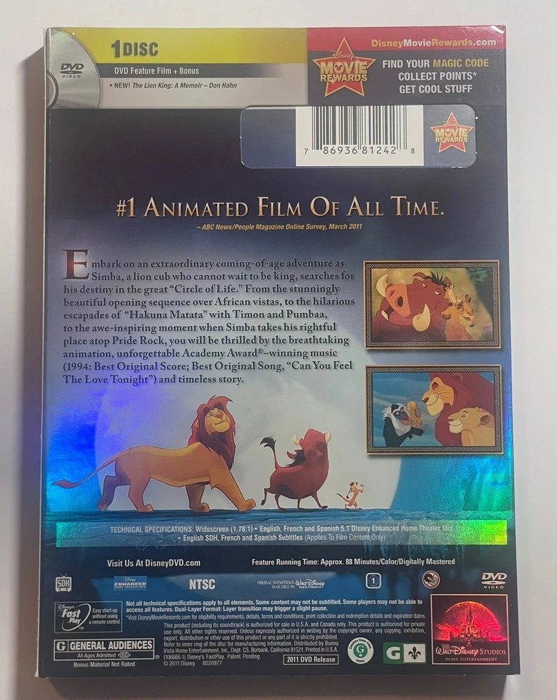 The 2011 Walt Disney The Lion King DVD Edition is a limited time release featuring the classic animated film in a Tall/DVD Case format. The DVD is rated G and includes English, French, and Spanish subtitles with a runtime of 88 minutes. This special edition includes bonus features such as "Don Hahn: A Memoir" and comes in a Widescreen format. The movie, directed by Rob Minkoff and Roger Allers, features iconic characters like Simba, Mufasa, Scar, and Nala, and is part of the beloved Walt Disney franchise. Message me with any questions. I combine shipping on multiple items purchased.