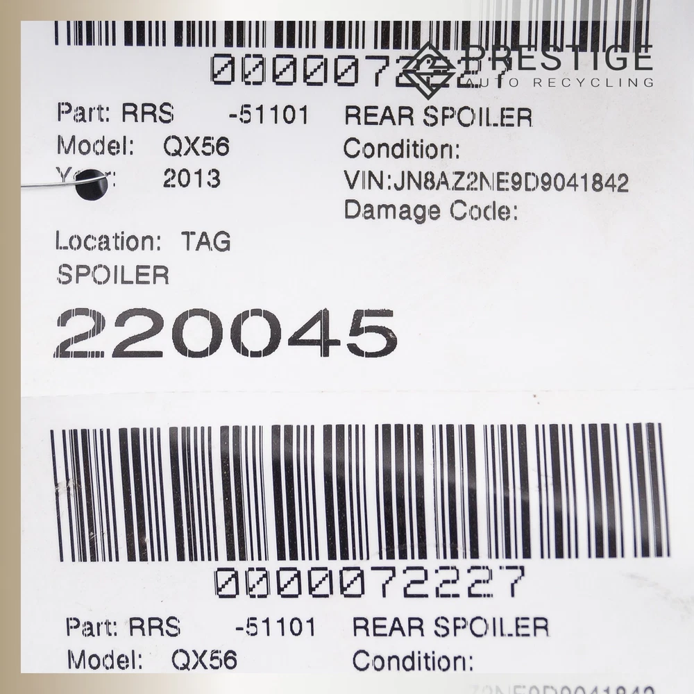 Prestige Auto Parts - Product Page Local pick-up available at 3400 Sunrise Blvd, Rancho Cordova, CA 95742 2011-2014 INFINITI QX56 QX80 Tailgate Spoiler Wing Rear Black 96030-1LA0A Not sure if the part fits? Send us your VIN, and we'll verify compatibility for you! Item Condition The item is in good condition, fully operational, and demonstrates normal signs of use. Please note that, as a used part, it may show light scuffs, scratches, or other minor imperfections, as shown in the photos provided. WHEN YOU BUY FROM US YOU AGREE TO OUR TERMS AND CONDITIONS: It is the buyer's responsibility to carefully inspect all of the photos for details and/or request more photos if necessary, what you see in photos is exactly what you will receive. Before purchase, the buyer MUST verify that the item will fit their vehicle. PLEASE NOTE: Make sure to verify fitment independently with your local dealer, information in the “compatibility” section is generated by eBay Motors, not from us. IF YOU HAVE ANY QUESTIONS, CONTACT US VIA EBAY MESSAGING BEFORE PURCHASING. Payment We accept PayPal, VISA, MasterCard, Discover, and American Express. Sales tax collected by eBay where applicable. For local orders, pay on pickup available. Shipping Most items ship within 24 hours of payment; items paid for on the weekend or holidays ship on the following business day. We ship by FedEx, UPS, USPS, and regional freight/LTL carriers, whichever option is most affordable and/or faster. Shipping prices for ground apply only to the continental United States. Anywhere else is considered international shipping and will have an international shipping rate. Any international customs fees are the responsibility of the buyer. Any free shipping we offer is for the continental United States only. If you are from Hawaii, Alaska, or a Territory of the United States, please request a shipping total before bidding and we will do our best to keep the cost low. For orders placed outside of the United States, we ship ONLY through the eBay Global Shipping Program. If you are outside of the US, use the eBay international shipping tool above to receive a price for shipping costs. Local pickup and delivery options also available, please contact us for arrangements. PLEASE NOTE: Oversized items like engines, transmissions, bumpers, doors, hoods, trunk lids, fenders and other similar items will be shipped via Freight Shipping and MUST be shipped to a business address with a dock or forklift access; otherwise, liftgate and/or residential delivery fees may apply. YOU MUST CONTACT US FIRST FOR A QUOTE BEFORE PURCHASING SAID ITEMS. Warranty and Returns All returns must be made within 30 days of item being received by the customer only if the item is non-functional or if it differs substantially from the description. Buyer is fully responsible for shipping cost of the return. We are not liable to pay for any labor fees associated with the installation or removal of any parts sold by us. All electronics are tested before removed from vehicle. IF NOT FUNCTIONAL, WE WILL NOT SELL. If the item is defected we will state accordingly and is sold for parts only. If you have any questions about the part you’re bidding on, PLEASE ASK QUESTIONS PRIOR TO BIDDING. 90 DAY WARRANTIES are available. Contact Us If you have questions about any part, please contact us BEFORE purchasing via eBay messaging. HOW DID WE DO? We are a small, family owned business dependent on our valuable customers. Once you have received your item in satisfactory condition, would you be so kind as to leave us feedback? If there is a concern that would cause you to want to leave negative feedback, please contact us first and we will do our best to resolve the issue. Thank you and God bless! © 2025 Prestige Auto Recycling. All rights reserved.