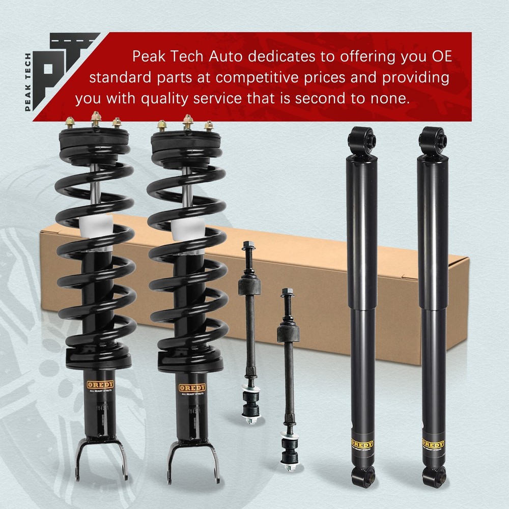 Please kindly know that Peak Tech is a certified distributor of Oredy products. Item in this listing is from brand Oredy. Store Home New Arrival View Feedback Contact us Add to Favourites 6PC Front Struts & Rear Shock Absorbers & Sway Bars for 2011-2018 Ram 1500 2009 2010 Dodge Ram 1500 4WD Items Description Package Includes: 1x Front Driver Side Complete Strut + 1x Front Passenger Side Complete Strut 1x Front Driver Side Complete Shock Absorber + 1x Front Passenger Side Complete Shock Absorber 1x Front Driver Side Complete Sway Bar + 1x Front Passenger Side Complete Sway Bar Compatibility: For 2009 2010 Dodge Ram 1500 (Sport, SLT, ST, Laramie, 4WD, w/o air suspension) For 2011 - 2018 Ram 1500 (4.7L & 5.7L, 4WD, w/o air suspension, w/o TRX Package) Shipping Payment Return Warranty About us Shipping All orders in the continental 48 States will be shipped free of charge. Orders placed before 12pm (Eastern Standard) will be shipped the same business day of purchase. We only ship to the address provided to us at the time of checkout. Please verify the shipping address before making any payment. We do not ship to Hawaii, Alaska, Puerto Rico, APO/FPO/PO Boxes. Payment Paypal, Visa, and MasterCard are accepted forms of payment. Please use eBay checkout system when place your order. Immediate payment is required for all orders. Return Buyer has 30 days to contact us and 10 days to return it from the date buyer's return request was received. Please note we only accept return for brand new products. When the return mistake is made on seller, we will provide a free return. Or, customer will be charged for return shipping fee. We will issue a refund to buyer after receiving and checking return packages. Warranty Peak Tech provides a Lifetime Warranty for original purchasers. If an auto part is defective, Peak Tech will provide ONE-Time replacement. Buyer needs to pay for the shipping cost of replacements occurred in warranty process. Buyer needs to provide Pictures or Video of damaged goods. About us Peak Tech focuses on auto parts and provides struts and shock absorbers suitable for a wide range of applications. Peak Tech products deliver the look, feel, fit and performance of OE. We provide buyers with professional customer service, and hope to offer buyers a better shopping experience. You May Also Like for Honda Accord 2008 - 2012 2.4L 2x Struts + 2x Sway Bars Front Right Left Side for Honda CR-V 2002 2003 2004 2005 2006 2PCs Struts Coil Spring Front Right Left for Honda CR-V CRV 2007 2008 2009- 2014 2PCs Struts Coil Spring Front Right Left for Honda Accord 2008 - 2012 2.4L 2PCs Struts Coil Spring Front Right Left Side for 2006 - 2011 Honda Civic 1.8L Sedan & Acura CSX 2PCs Struts Front Right Left Copyright © 2024, peak-tech-autoparts All Rights Reserved