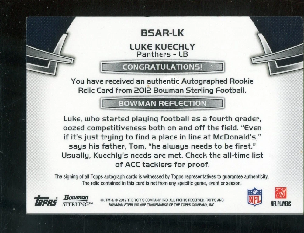 2012 Bowman Sterling Luke Kuechly Panthers RC Rookie Jersey AUTO