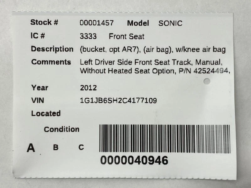 Hollander Welcome to our eBay store! Left Driver Side Front Seat Track Manual Fits 2012 Chevrolet Sonic 83048 Description This listing is for a used Left Driver Side Front Manual Seat Track, Without Heated Seat Option. The part pictured is the actual item you will receive, no other parts are included. This part is used so normal wear is to be expected. Please see part fitment information below and please match part numbers before buying this item. If you have any questions please let us know. Donor Vehicle Model : SONIC Year : 2012 Mileage : 46000 (0 = not available or unknown) Stock Number : 001457 Notes : LEFT DRIVER SIDE FRONT SEAT TRACK, M 031125 This Part Will Fit These Makes And Models With These Options SONIC 12 (bucket, opt AR7), (air bag), w/knee air bag (opt AYF), cloth, (manual), L., w/o heated seat About Us Payment Shipping Returns Warranty About Us Please contact us with any questions BEFORE purchasing. If you are unsure if this part will fit we are happy to verify fitment for you prior to purchase via your vehicle's VIN (Vehicle Identification Number). We try to answer all messages in 24 hours. Please note that orders are sent to the shipping department throughout the day therefore we cannot guarantee adjustments to orders after payment is received. Our hours of operation are: Monday - Friday 8:00AM - 5:00 PM CST Saturday - Sunday Closed Payment All orders must be paid in full prior to shipment. Payments are processed through eBay. We accept credit card and cash for Local Pickup orders. If payment is not received, an Unpaid Item case will be opened for the sake of seller fee reimbursement. Sales tax will be collected by eBay where applicable. Shipping We ship items via UPS, USPS, or LTL Freight Carriers. Tracking information is uploaded to the order once the item is shipped. Larger items such as Engines, Transmissions, Doors, Tailgates, Trunk Lids, Rear Axles etc. will ship via freight. Freight items are unable to be shipped until we have all the necessary information required by the carrier. Typically that includes a valid business name, address, valid phone number, and hours of operation. Be sure to provide us with all necessary contact information with your order as well. Freight charges are for zoned commercial addresses with a forklift or loading dock. If the location requires the assistance of a lift gate there will be an additonal fee. If a commercial address is not able to be provided we can ship the item to your residence for an additional fee. Add $100 for Residential delivery Add $85 for Liftgate delivery Most orders are shipped within one business day. If there is an issue with your order or item we will reach out to you before we ship the order. Once payment is received for a freight item we will send a message asking for additional information needed for the freight carrier. Without this information we will not be able to ship your item. If a USPS or UPS item is damaged during shipping please keep all packaging and loose parts complete with the package. Send us a message through Ebay with some pictures and your invoice number. We will work on getting a replacement item to you while handling the UPS claim as well. Please Inspect all freight shipments before signing for them at time of delivery! If there has been any damage to the item during shipping inspect the item to see if you can still use it or not. If you can still use the item, notate the damage on the delivery ticket that the driver is keeping then hand it back to them. Send us a message with a copy of your receipt and the delivery ticket you kept. We will take care of the damage claim with the freight carrier. If you cannot use the product simply decline the shipment send us a message and we will work on getting a replacement or refund to you. It is very important to not sign for any damaged product without notating it on the delivery ticket or denying the shipment. You have the right to inspect the package for obvious signs of damage prior to signing and accepting the delivery. If a delivery driver is refusing to let you inspect the shipment before you sign for it, do not sign, refuse the shipment and contact us through eBay messaging. When you sign for the delivery on the carrier's Bill Of Lading (BOL) it is accepting the merchandise as is and in good order. So please inspect your package before signing for it. We do understand that sometimes there will be damage that is missed, don’t worry we will still be able to help you. If you do find concealed damage after you sign for the package let us know through messages and send some pictures as well. We will get with the freight company and start a claim. We are not responsible for any delays incurred by the shipping company. No International shipping is available outside of the eBay Global Shipping program. We do not ship to PO Boxes, Hawaii, Alaska, Puerto Rico, APO, FPO, AA, AE, AP and U.S. Territories outside of the continental U.S. International orders are shipped via eBay’s Global Shipping Program. Customer pickup at our location is also available. Please contact us prior to your purchase to arrange pick up. Returns If you need to return an item for any reason please contact us first to obtain a RMA number (Return Material Authorization). All returns must be authorized by us before being shipped back. Any items returned must include an RMA number clearly written on the side of the packaging. If you are returning a part because you bought the wrong one or no longer need it the original shipping charges are not refunded and you are responsible for the return shipping. All returns must be made within 30 days of the date of purchase. All parts must be returned in their original condition to receive full credit Once you obtain an RMA number, ship the item back to: Frontier Auto Parts, 2199 Ranger Hwy, Weatherford, TX 76088 Warranty All parts we sell through eBay Motors come with a 30-day warranty and a 30 day return period unless otherwise stated. 