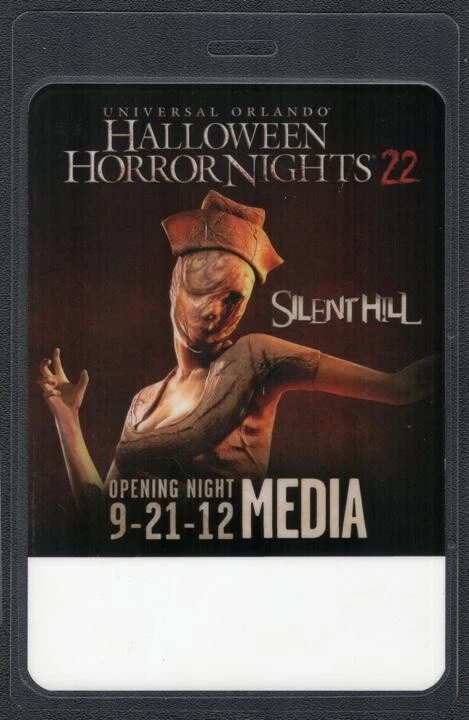 2012 Halloween Horror Nights 22 pass that is unused and in great condition. See all images for complete condition details. This is a laminated Media pass from Opening Night of the Silent Hill attraction during the Halloween Horror Nights 22 held on September 21, 2012 at Universal Studios in Orlando, Florida. This is an unmarked OTTO Manufacturing pass. This pass is 5-1/2" tall. This is the real deal. We guarantee that this pass is authentic, old, and original, and offer a 100% money back guarantee. We own the largest collection of authentic backstage passes in the world, and are the ultimate source for anything you may be looking for. These are select pieces from my personal collection. COMBINED SHIPPING - If you purchase more than one listing from us, we will combine shipping charges and you will just pay an extra 25¢ per listing for shipping. NO FOREIGN ORDERS - Shipping to all 50 States only.