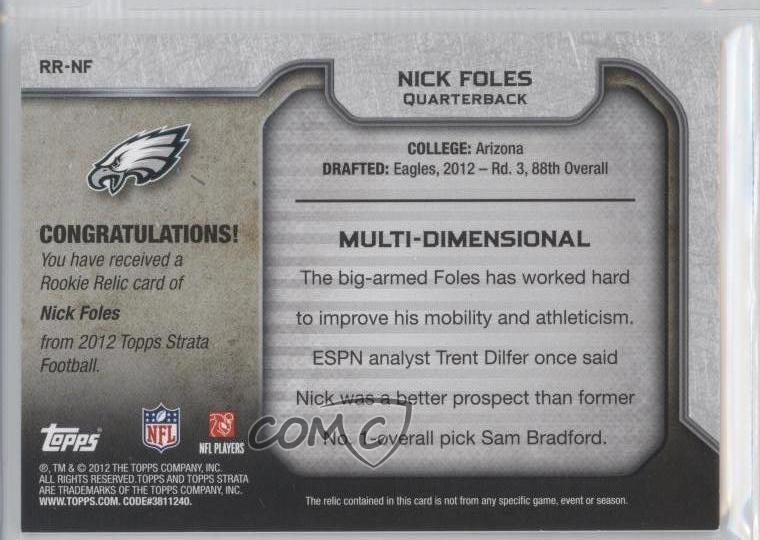 2012 Topps Strata - Rookie Relics - Bronze #RR-NF Nick Foles Qty Made: 150 - Rookie - Football Card - Featuring the Philadelphia Eagles - Featuring Nick Foles Search for more: 2012 Topps Strata Search for more: 2012 Topps Strata - Rookie Relics - Bronze View all of our Listings Auctions Buy It Now About Us Located in the beautiful Pacific Northwest, COMC (Check Out My Cards) is the world's largest consignment service for trading card singles. More than 10,000 people have used our consignment service to list over 50 million trading cards. Find out how we can help you consign your items on eBay by contacting us through eBay messaging. COMC -- "The Safe & Easy Way to Buy & Sell" Representative Image - Select Specific Item above to see image of actual item Representative Image - Select Specific Item above to see image of actual item Raw Condition for Modern Cards Unless otherwise noted, raw modern cards are listed in Near Mint-Mint condition or better. A NM-MT card appears to be Mint at first glance, but upon closer inspection, may exhibit some of the following: minor print defects (e.g. roller marks, print line, dimple), minor scratches, slight edge wear, and slight corner wear. Centering is clearly visible in the images provided and does not factor into our condition assessment. Raw Condition for Vintage Cards Unless otherwise noted, raw vintage cards are listed in Excellent condition or better. An EX card may exhibit some of the following: minor rounding of corners, surface wear, print defects, light scratches, and slight edge wear/chipping. Centering is clearly visible in the images provided and does not factor into our condition assessment. Domestic Shipping Combined shipping for multiple items is available. To receive combined shipping, please ensure all desired items are in your eBay shopping cart before proceeding to checkout. eBay limits orders to 40 items per order. We automatically combine multiple orders placed on the same day. If you place multiple orders on the same day, please contact us to request a refund of applicable shipping costs. Signature confirmation may be required on invoices over $400. All cards are protected and shipped securely. International Shipping COMC offers eBay's International Shipping (EIS) for international orders under $2,500* (see country exceptions below). All duties and import fees are paid at checkout; in the rare event that there are additional import fees upon delivery, these are borne by the buyer. EIS packages route through a shipping hub in Erlanger, KY before shipping to their final destination. Please note that EIS does not allow for combined shipments. The shipping rates are determined by eBay and cannot be adjusted. *Maximum sale price exceptions: Colombia, Kuwait ($2,000); Taiwan ($1,539); Chile, Costa Rica, Guatemala, Honduras, Trinidad and Tobago ($1,000); Antigua and Barbuda, Aruba, Belize, Dominica, Grenada, Philippines, Saint Kitts and Nevis, Saint Lucia, Montserrat, Turks and Caicos Islands ($500); Dominican Republic, El Salvador ($200). Please request a shipping quote through eBay messaging for orders that exceed the maximum sale price supported by eBay's International Shipping. You will be responsible for all duties and import fees for international orders shipped outside the EIS. All cards are protected and shipped securely. Payment COMC does not accept offers on our cards through our eBay storefront. COMC utilizes eBay’s managed payments system. If you are experiencing difficulties making a payment, please contact eBay for assistance. Return Policy Returns are only accepted on the rare occasion the item is not as described. If you are making a return, please initiate the return process through eBay so a mailing label can be provided for you. Prior to listing, our expert team carefully assessed this item to represent it accurately. Please review the description and high-definition images prior to purchasing to ensure this item meets your satisfaction. We welcome you to contact us if you have further questions about this item. Trust and Integrity COMC carefully assesses each item consigned to us to prevent fraudulent items from entering the marketplace. If you believe an item offered on COMC may be fraudulent, please contact us with details so we can investigate the issue. Items we determine are outside our supported items policy may be removed. Last Modified: 6/19/2025 3:36:15 AM PDT