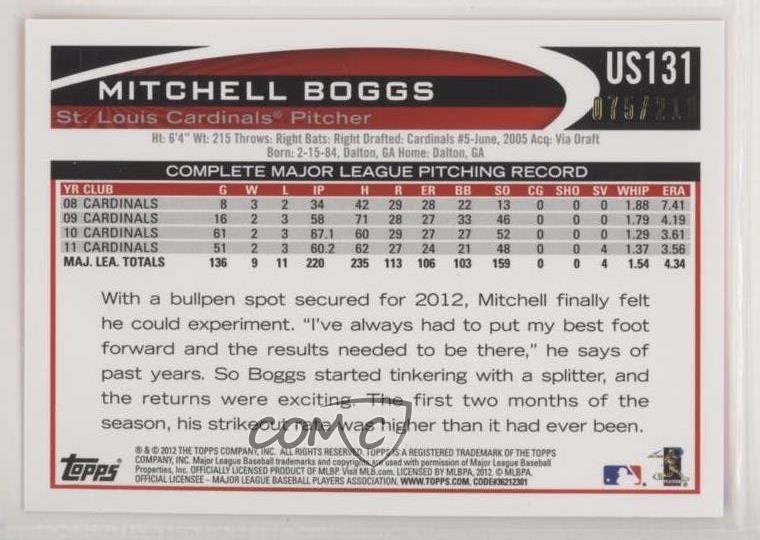 2012 Topps Update Series - [Base] - Holiday Factory Set Bonus Pack Orange #US131 Mitchell Boggs Qty Made: 210 - Baseball Card - Featuring the St. Louis Cardinals - Featuring Mitchell Boggs Search for more: 2012 Topps Update Series Search for more: 2012 Topps Update Series - [Base] - Holiday Factory Set Bonus Pack Orange View all of our Listings Auctions Buy It Now About Us Located in the beautiful Pacific Northwest, COMC (Check Out My Cards) is the world's largest consignment service for trading card singles. More than 10,000 people have used our consignment service to list over 50 million trading cards. Find out how we can help you consign your items on eBay by contacting us through eBay messaging. COMC -- "The Safe & Easy Way to Buy & Sell" Representative Image - Select Specific Item above to see image of actual item Representative Image - Select Specific Item above to see image of actual item Raw Condition for Modern Cards Unless otherwise noted, raw modern cards are listed in Near Mint-Mint condition or better. A NM-MT card appears to be Mint at first glance, but upon closer inspection, may exhibit some of the following: minor print defects (e.g. roller marks, print line, dimple), minor scratches, slight edge wear, and slight corner wear. Centering is clearly visible in the images provided and does not factor into our condition assessment. Raw Condition for Vintage Cards Unless otherwise noted, raw vintage cards are listed in Excellent condition or better. An EX card may exhibit some of the following: minor rounding of corners, surface wear, print defects, light scratches, and slight edge wear/chipping. Centering is clearly visible in the images provided and does not factor into our condition assessment. Domestic Shipping Combined shipping for multiple items is available. To receive combined shipping, please ensure all desired items are in your eBay shopping cart before proceeding to checkout. eBay limits orders to 40 items per order. We automatically combine multiple orders placed on the same day. If you place multiple orders on the same day, please contact us to request a refund of applicable shipping costs. Signature confirmation may be required on invoices over $400. All cards are protected and shipped securely. International Shipping COMC offers eBay's International Shipping (EIS) for international orders under $2,500* (see country exceptions below). All duties and import fees are paid at checkout; in the rare event that there are additional import fees upon delivery, these are borne by the buyer. EIS packages route through a shipping hub in Erlanger, KY before shipping to their final destination. Please note that EIS does not allow for combined shipments. The shipping rates are determined by eBay and cannot be adjusted. *Maximum sale price exceptions: Colombia, Kuwait ($2,000); Taiwan ($1,539); Chile, Costa Rica, Guatemala, Honduras, Trinidad and Tobago ($1,000); Antigua and Barbuda, Aruba, Belize, Dominica, Grenada, Philippines, Saint Kitts and Nevis, Saint Lucia, Montserrat, Turks and Caicos Islands ($500); Dominican Republic, El Salvador ($200). Please request a shipping quote through eBay messaging for orders that exceed the maximum sale price supported by eBay's International Shipping. You will be responsible for all duties and import fees for international orders shipped outside the EIS. All cards are protected and shipped securely. Payment COMC does not accept offers on our cards through our eBay storefront. COMC utilizes eBay’s managed payments system. If you are experiencing difficulties making a payment, please contact eBay for assistance. Return Policy Returns are only accepted on the rare occasion the item is not as described. If you are making a return, please initiate the return process through eBay so a mailing label can be provided for you. Prior to listing, our expert team carefully assessed this item to represent it accurately. Please review the description and high-definition images prior to purchasing to ensure this item meets your satisfaction. We welcome you to contact us if you have further questions about this item. Trust and Integrity COMC carefully assesses each item consigned to us to prevent fraudulent items from entering the marketplace. If you believe an item offered on COMC may be fraudulent, please contact us with details so we can investigate the issue. Items we determine are outside our supported items policy may be removed. Last Modified: 6/10/2025 6:52:24 AM PDT