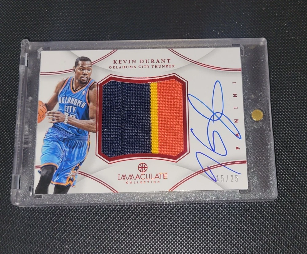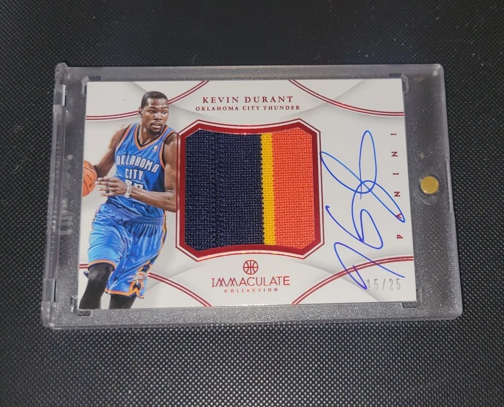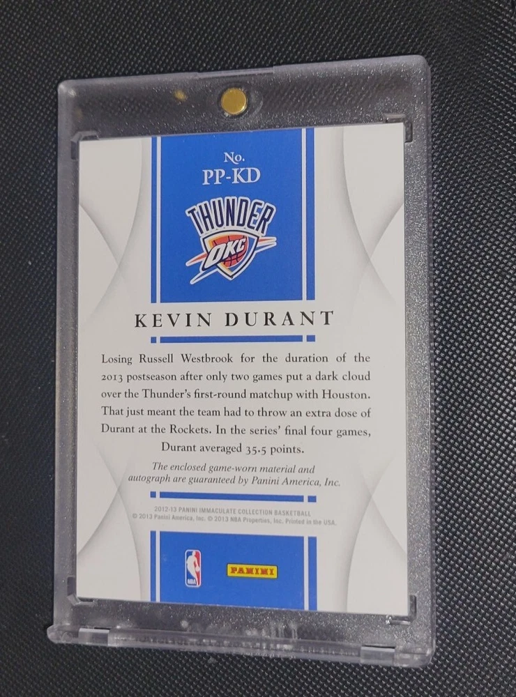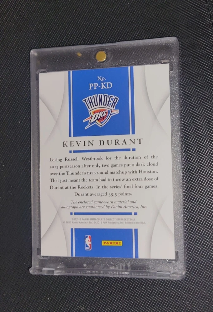 This 2012-13 Panini Immaculate Collection Sports Trading Card features NBA player Kevin Durant of the Oklahoma City Thunder team. The autographed card is hard signed and has a red parallel/variety. It is a premium patch card with a near mint or better condition, and is ungraded. The card is a single product from the Panini Immaculate Collection series, with a card number of #PP-KD. It is a short print card with a serial number, and is written in Chinese language. This original and authentic card from the modern era of basketball sports cards is sure to be a valuable addition to any collection.