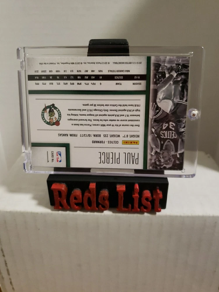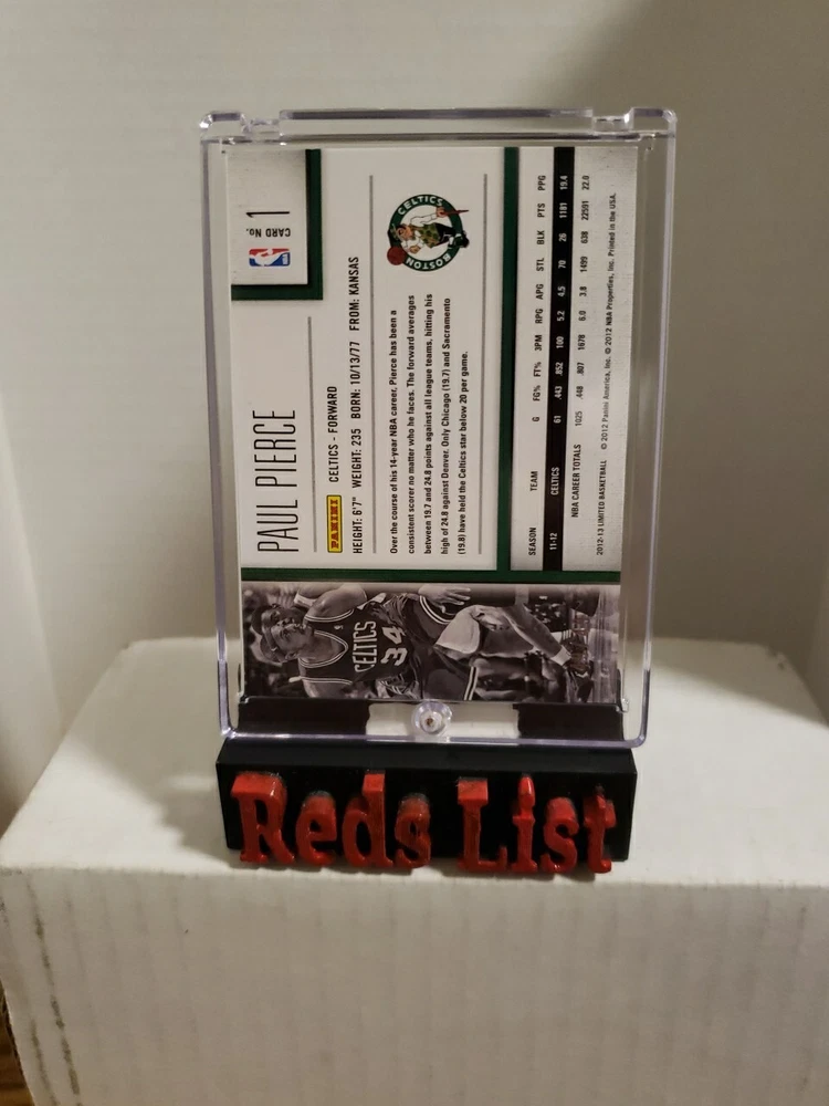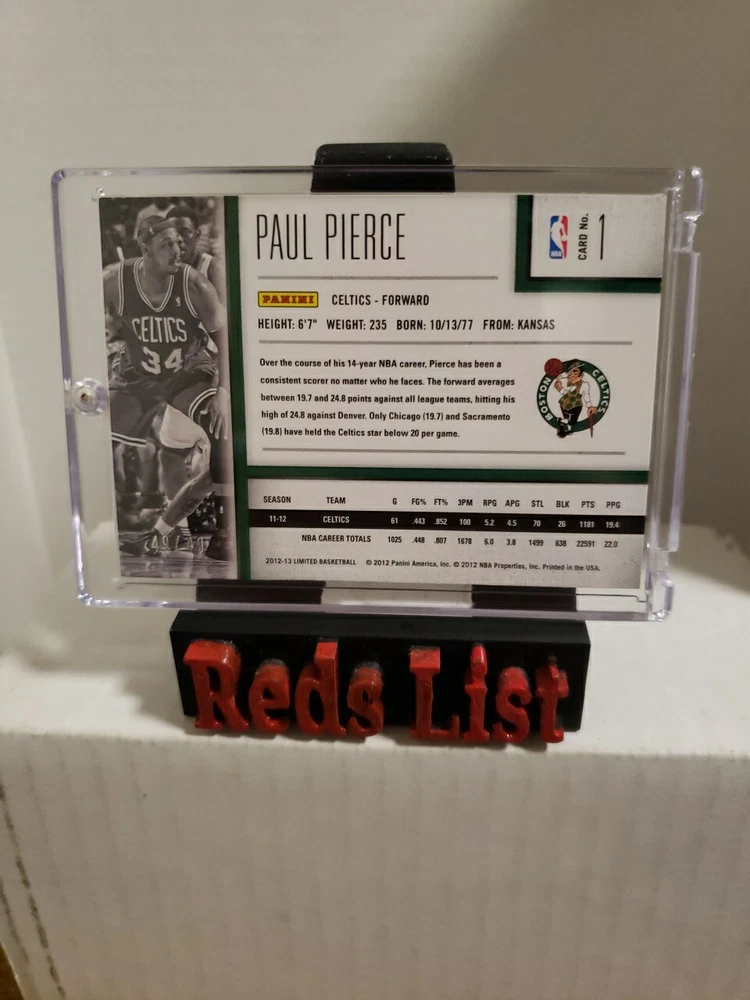 2012-13 Panini Limited Silver Spotlight #1 Paul Pierce 49/49 Boston Celtics HOF Condition is "Very Good". Shipped with USPS Gound Advantage Due to my schedule The Post Office is close before I head to work and close when I get off work Sunday - Friday I'm only able to go to the Post Office Saturday, but I sometimes get off early so if payment is not received by night before they won't be shipped until the following off day so for any delay of shipping i will try my best to get it off on time I'm not a professional grader...... The majority of my cards are packed fresh open by myself, however I've bought many cards over the years to build my sets. I bought cards from card shops, card shows, Instagram, and even eBay to add to my collection. Now my collection to me isn't what it used to be, so I'm slowly getting rid of my collection. If you're looking for cards let me know I have thousands. I didn't check every card for flaws, my feedback speaks for itself on my other pages. I use the term VERY GOOD good to cover myself LOOK AT THE THE PICTURES. And for everyone who expects every card to be a mint 9 or 10 very good. It could have a ding here or a rough corner there, ask for pics What U See Is What U Get. Additional cards will be $1 Wait for invoice if not I will not give discount If you are looking for other cards hit me up, I have singles, Rookies , Jersey's , Auto's , Numbered, some sets i have a lot. Thank you, if you have any questions just ask. Good luck.