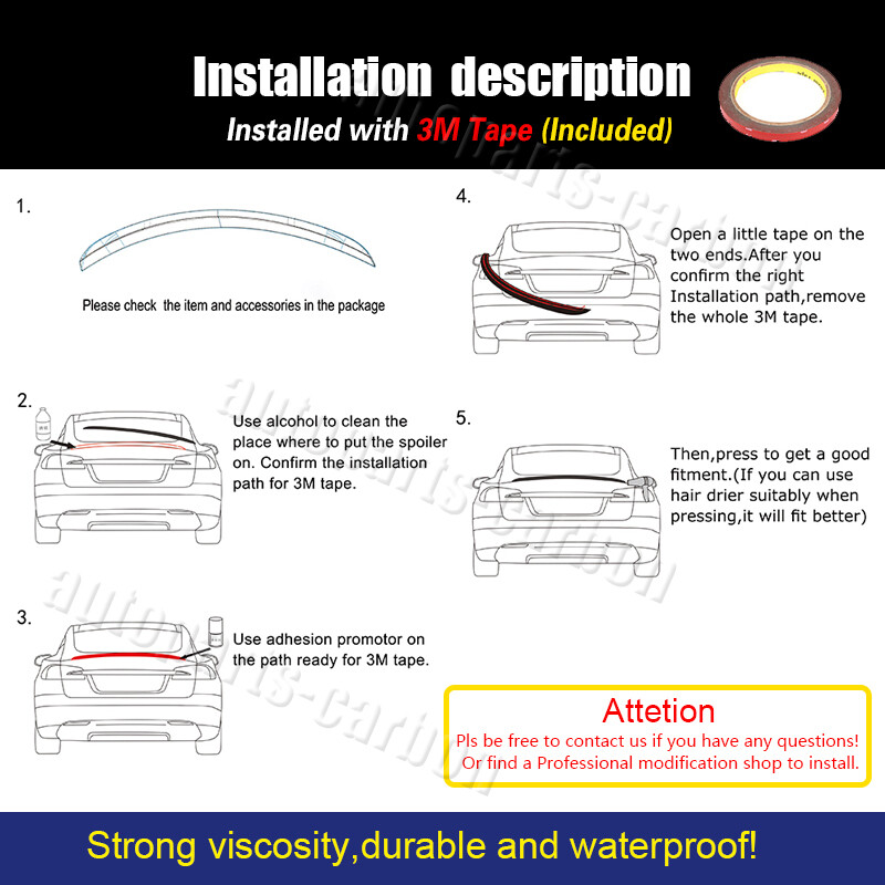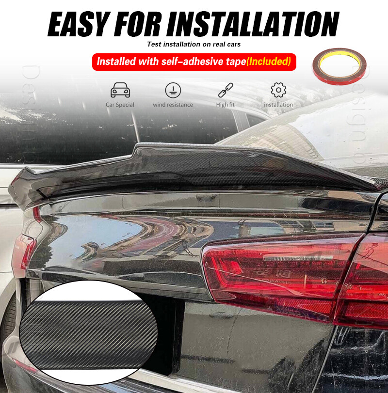 Fitment:Fit for Audi A6 C7 Base/Sline S6 Sedan 2012 2013 2014 2015 2016 2017 2018 2019 Feature: 1. No drill or any modification required, easy installation with glue tape the spoiler could be removed later without damaging the paint. 2.3*3 Twill Weave Carbon Fiber material with high Quality UV-Protected Clear Coating to prevent from yellowing and hold its high glossy finish 3.Car rear trunk spoiler are designed to factory specifications for easy installation and clean,installed with self-adhesive tape.peel off the tape on the back, then stick the spoiler on the lid of the trunk. It is easy to clean in daily use. 4.New Manufacturing Process, Vacuum moulding, more lightweight and durable than other ordinary carbon parts 5.Enhance Visual Impact, Create An New Iconic Racing Look And Set Fitment:Fit for Audi A6 C7 Base/Sline S6 Sedan 2012 2013 2014 2015 2016 2017 2018 2019 Feature: 1. No drill or any modification required, easy installation with glue tape the spoiler could be removed later without damaging the paint. 2.3*3 Twill Weave Carbon Fiber material with high Quality UV-Protected Clear Coating to prevent from yellowing and hold its high glossy finish 3.Car rear trunk spoiler are designed to factory specifications for easy installation and clean,installed with self-adhesive tape.peel off the tape on the back, then stick the spoiler on the lid of the trunk. It is easy to clean in daily use. 4.New Manufacturing Process, Vacuum moulding, more lightweight and durable than other ordinary carbon parts 5.Enhance Visual Impact, Create An New Iconic Racing Look And Set Your Car Apart From Similar Models On Street 6.Maintain the stability of the vehicle when in high speeds, reducing wind resistance, saving fuel and keeping safety Specification: Material:Carbon Fiber Color:Carbon Fiber Black Pattern:3X3 twill weaven Packaging:Polyfoam box Attachment Method:Adhesive Installation : With glue tape Package Includes: 1x Carbon Fiber Trunk Spoiler and glue tape Delivery details Payment and TAX Warranty Policy Return Policy Contact us Delivery details NOTE: The shipping fee is only for the mainland of each country, it does not include the overseas territories, such as Virgin Islands (U.S.) , Puerto Rico, Hawaii , French Reunion Island, etc. But on ebay, when buyers from Puerto Rico and overseas territories , the shipping fee is equal to United States, it is NOT correct,. please contact us for correct shipping fee, or we will cancel the order. Sorry for the inconvenience, and thanks for your cooperation. 1. If you want to upgrade the shipping, please contact us before making payment, we will revise the shipping fee. 2. We will ship according to your Ebay address. Please make sure it is correct and include phone number for delivery. If you want to know the exact shipping time , please contact us . Payment and TAX 1.We accept Multiple Payment Methods Available: Credit Card, Debit Card, Gift Card, Apple Pay, Goggle Pay, PayPal and PayPal Cred. 2.Please leave note for your special request (e.g. Colors or Size) in ebay note when you pay the order. 3.Your must complete the payment within 7 days or Ebay will automatically open unpaid item case For US Buyer:The invoice value of each item is less than 800USD ,so you no need to pay any tariff . NON-US Buyer Note: Most countries are tax free based on our invoices, if tax is required, which will be buyer's responsibility. Warranty Policy We Warranty Our Product Within the Limited Warranty Policy Specified on Ebay. Please Email us if ou have any question regarding the warranty policy on a specific item. Most of the items are Aftermarket Parts and they are intended for off-road usage only, therefore no installation instruction will be included, Professional installation are Highly Recommended. We are not responsible for any damages to the item or the vehicle that occur during the installation of the item.Also, Please Make Sure Proper Installation is Performed as we are not responsible for item being missing or flew off after the installation. if you don't think the item can stay on the car properly, please do not attempt to drive the car with it and please check with professional shops/mechanics or contact us for assistance. Return Policy We Accept Returns Within the Return Period On Ebay. Return Authorization/Return Approval is Required For Every Return. So If you Wish to Make a Return On Your Purchase. Please Contact us Before You Send The item back For any damages occured to the item upon arrival, Please notify us within 5 days of the delivery so we can take proper action to fix the issue. So Please Kindly inspect and check the item condition upon arrival.For Any other Return Inquries, You can contact us within the return period to obtain return authorization/return approval. In case of return, the merchandise needs to be returned in original condition with origi- nal packaging in order to be eligible for an exchange or a refund. Items must be not opened in their original package. Any mark of installation, mounting, cutting, scratch or using will not be allowed. Contact us 1.We are trying our best to explain all details of the products here! If you have any question, please feel free to contact us by Ebay message, and We will get back to you within 24-48 hours. 2.Customer satisfaction is our NO.1 priority. If you are not happy with the item that you purchase, please contact us first. We will try our best to solve the problem with you.Please leave us a positive feedback if you receive the item.Please do not leave negative or neutral feedback without any contact.If you haven't received item in 30 days, please contact us and we will arrange refund.We appreciate your business.Happy Bidding & Have a nice day! 3.Working hours: From 8 a.m. to 6 p.m. from Monday to Friday. From 8 a.m. to 12 a.m. on Saturday morning Holiday/Rest time: Saturday afternoon and Sunday