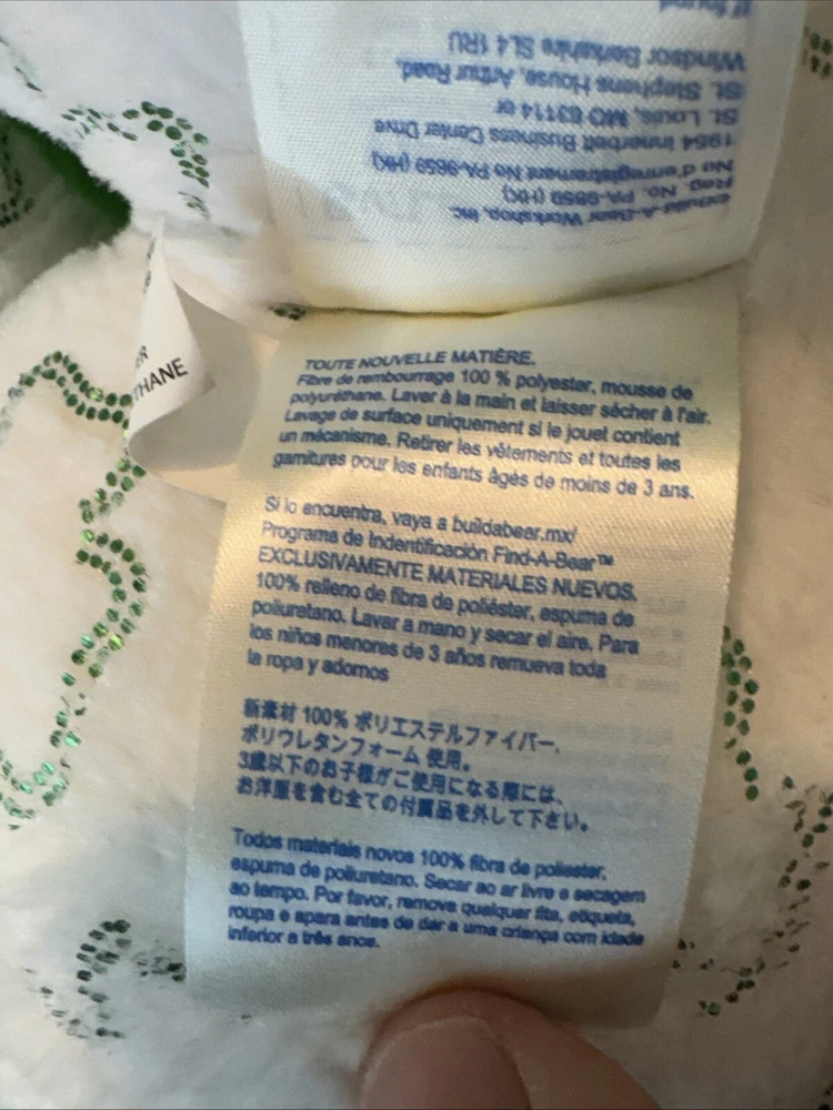 Time Period Manufactured: 2010-2019 Character: Shimmer Shamrock Number of Items: 1 Type: Plush Bear Material: Plush Original/Licensed Reproduction: Original Year Manufactured: 2013 Brand: Build-A-Bear Workshop Size: 16 - 20 in Bear Color: White Eye Color: Green Animal Species: Bear Theme: Lucky Age Level: 3-4 Years UPC: Does not apply Occasion: All Occasions Collection: Bearstones gtin13: Does not apply Franchise: Build-a-Bear Features: Retired Item Height: 16 in Country/Region of Manufacture: China