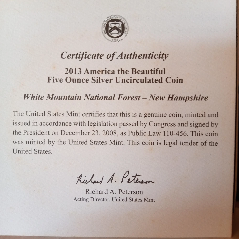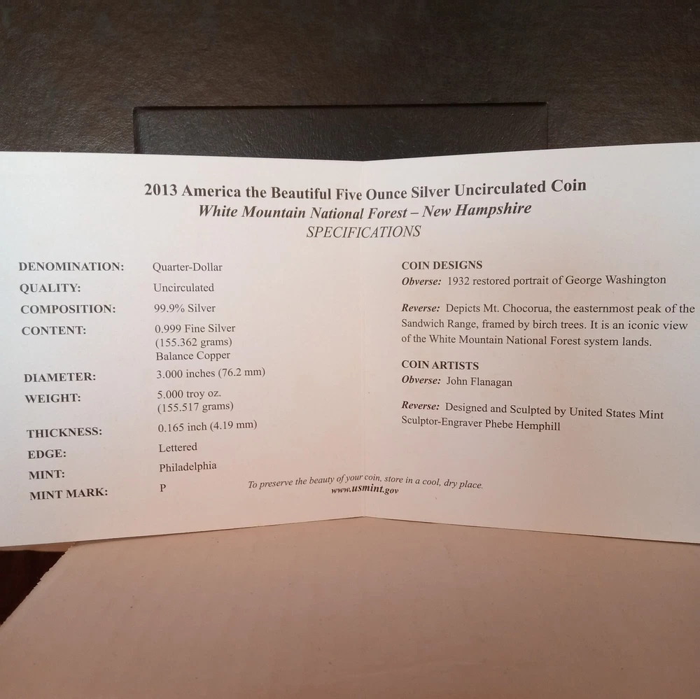 2013 P - White Mountain National Forest - 5 oz Silver - Mint Box & COA - .999 Fine - NQ 5. Shipped with USPS Ground Advantage.