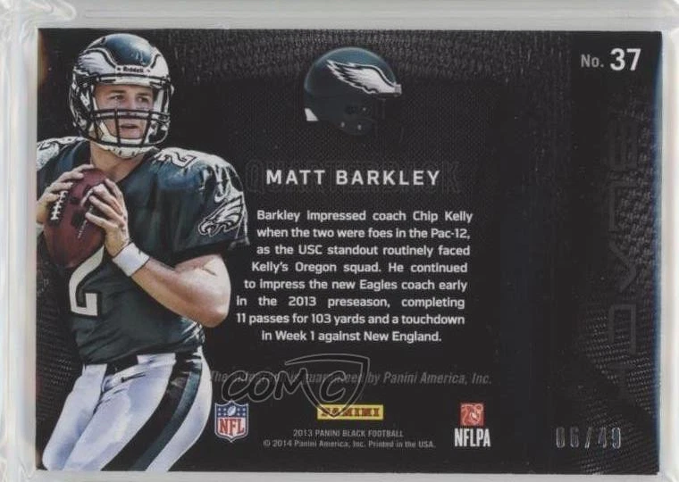 This 2013 Panini Black #37 Matt Barkley Rookie Shadow Box Jersey Auto #24/49 Eagles card is a must-have for any Philadelphia Eagles fan or avid collector of sports trading cards. Featuring an autographed jersey from the National Football League (NFL) and a serial number, this card is a limited edition and a rare find. The card is part of the 2013 Panini Black set and has a card number of 37. It also has a parallel/variety feature and is a rookie card. This card is perfect for those who want to add to their collection or those who are looking for a unique and valuable item to gift.