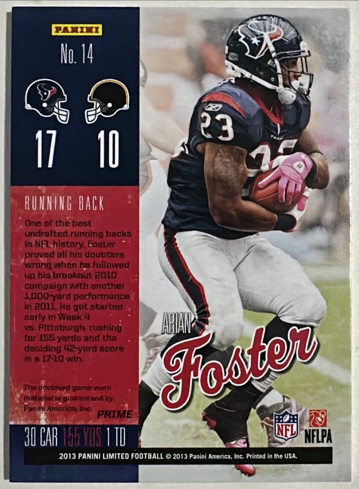 Thank you for checking out this listing. For sale is a Prime Parallel Game Day Materials card of Arian Foster from 2013 Panini Limited, serial numbered 2/15 and featuring Dirty Patch worn in the Texans October 2, 2011 Game vs. the Steelers. I don't use stock photos for my listings - the card in the photos is the actual one for sale. I do offer combined shipping and any additional cards are $0.25 each. If you're interested in buying multiple items and the combined shipping discount doesn't appear automatically or won't work because of auto pay, let me know - I'm happy to work with you. The card will be carefully packaged with tracking. Items are usually shipped within 1 business day of receiving payment.
