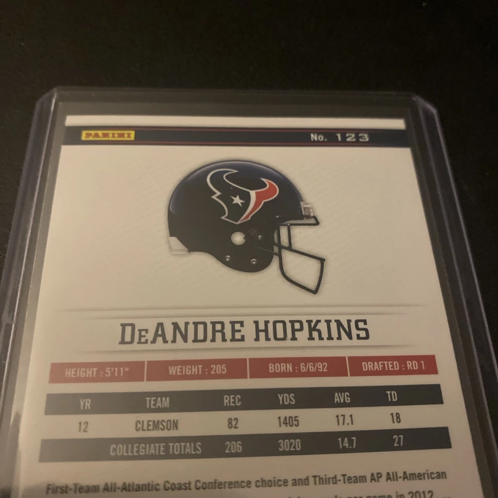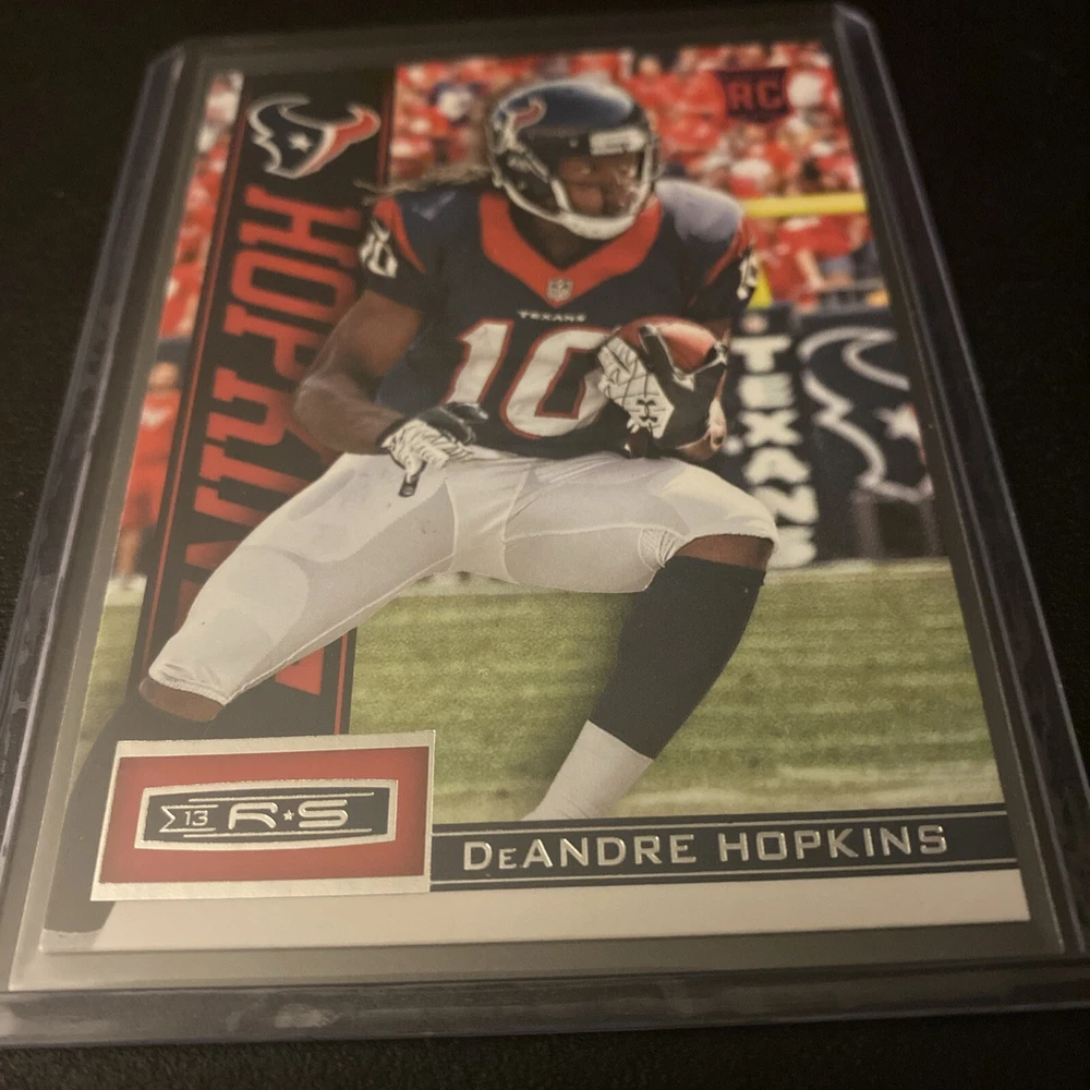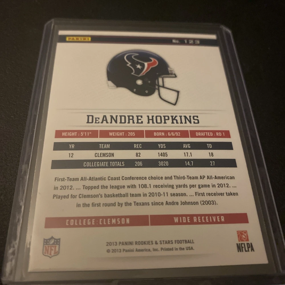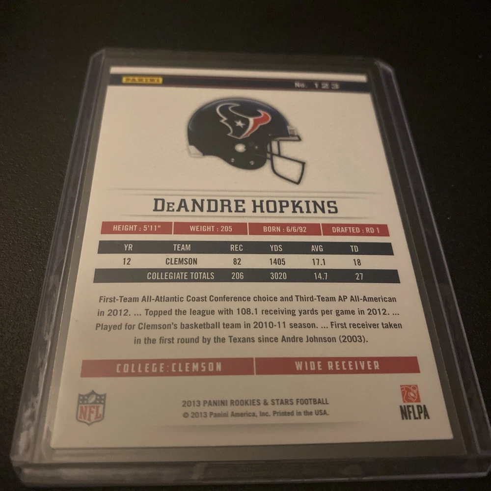 Season:2013Team:Kansas City Chiefs, Houston Texans, Tennessee Titans, Arizona CardinalsSport:FootballLeague:National Football League (NFL)Type:Sports Trading CardAutographed:NoYear Manufactured:2013Manufacturer:PaniniFeatures:Rookie, Base SetSet:2013 Panini Rookies & StarsCountry/Region of Manufacture:JerseyCard Number:123Player/Athlete:DeAndre Hopkins