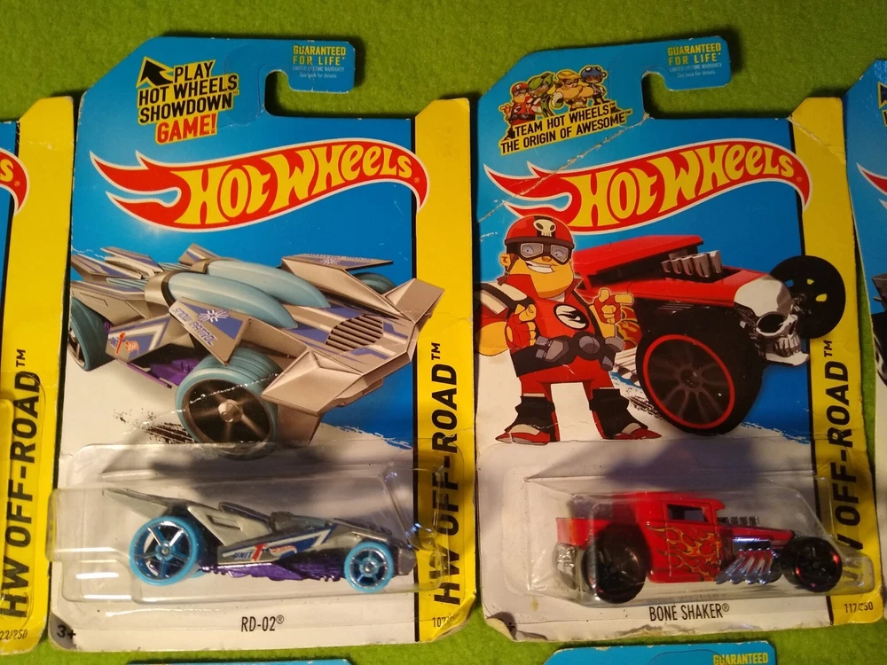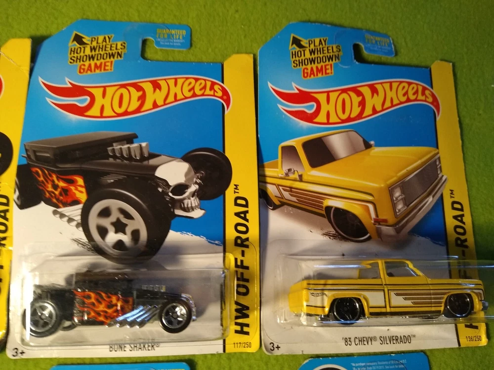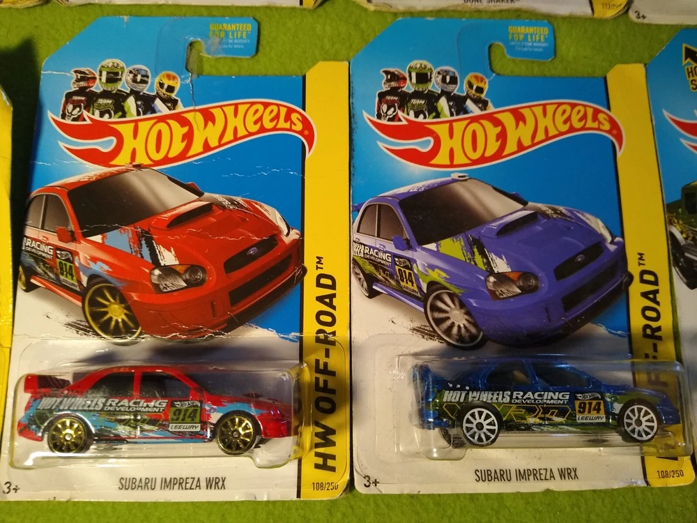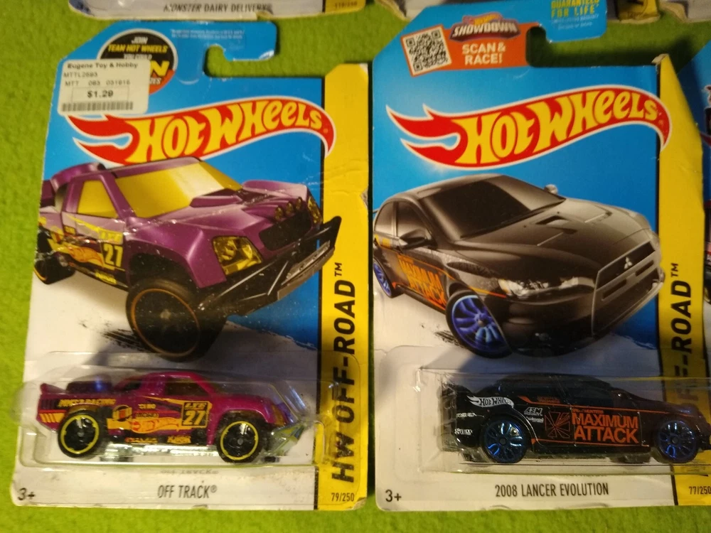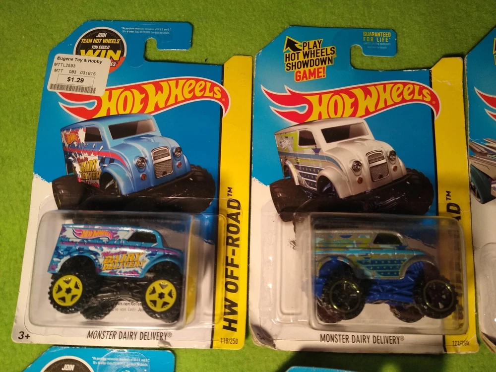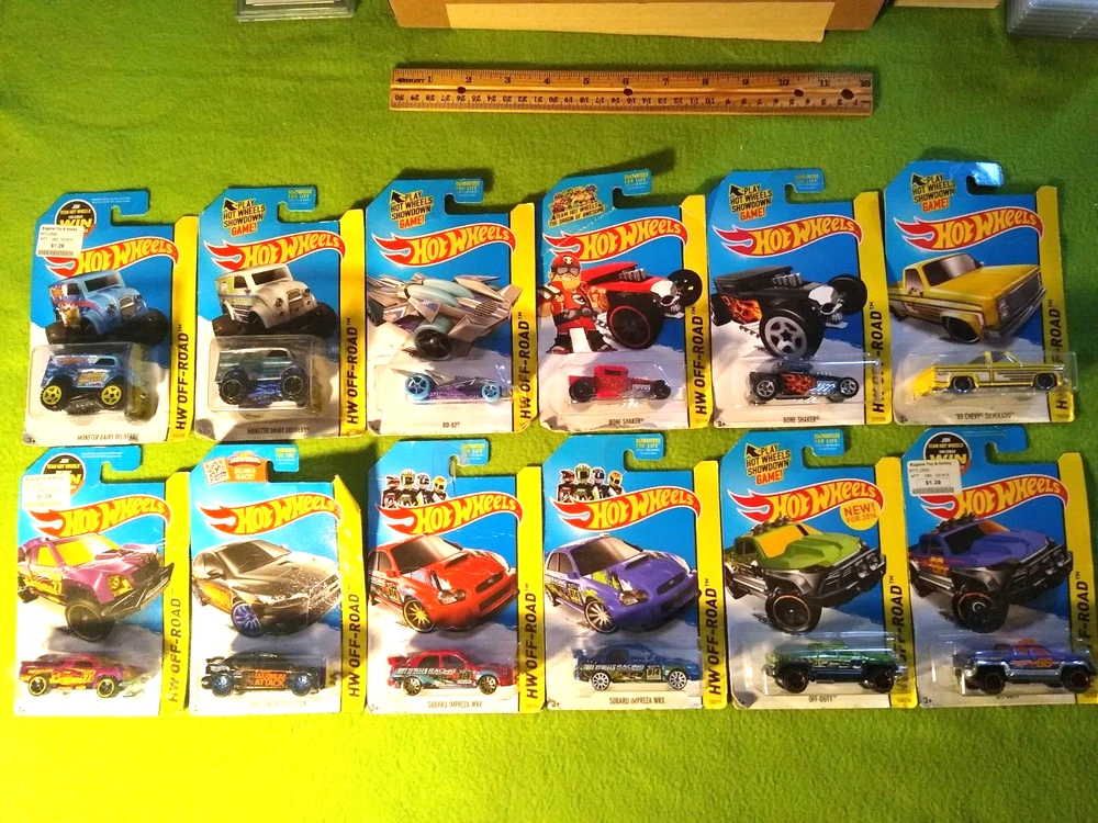 2013 Special, Premium, Hot Wheels Off-Road Vehicles. 12 new. Included are: 1) Monster Dairy Delivery, blue. 2) Monster Dairy Delivery, silver. 3) RD-02, gray with blue wheels. 4) Bone Shaker, red. 5) Bone Shaker, black. 6) 83 Chevy Silverado, yellow. 7) Off Track, purple. 8) 2008 Lance Evolution. 9) Subaru Impreza WRX, red. 10) Subaru Impreza WRX, blue. 11) Off-Duty, green. 12) Off-Duty, purple. All 12 are new in package. Free shipping.