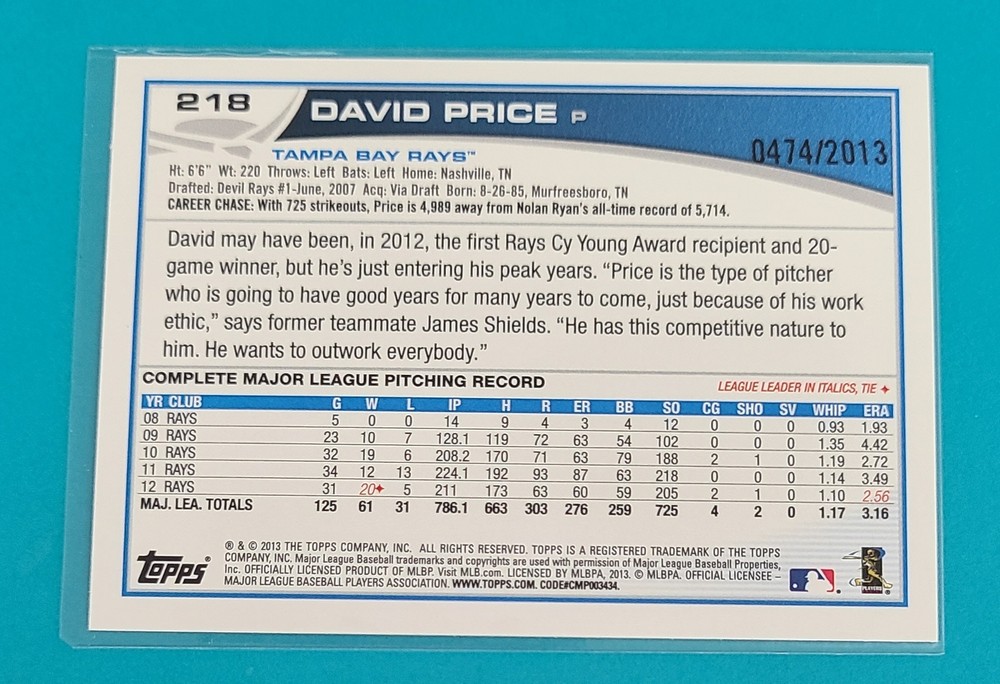 Shop Our Bargain Bin Store Category - 50% Off 6+ Items at Checkout (Applies to "The Bargain Bin" Category Only)! Visit Our Store For Our Current Multi Item Purchase Coupons! 2013 Topps Opening Day Blue #218 David Price /2013 Tampa Bay Rays BASEBALL Card Z9 Near Mint or Better - - See all pictures for best details - Please ask questions Receive 10% off 2+ Items @ Checkout - Code: 10OFFALLDAY Checkout with 7+ Items & Receive 25% Off Order - Code: BUY7SAVE25 As Always: Checkout with 15+ Items & receive 30% off your entire Order - No Code needed! Just Click on our Store Image/Picture (Next to Our Name) To view & search our items by Your favorite Players or more specific categories (Sports by Decades) Save/Follow/Subscribe to Our Store to Receive Future Offers! Come back often for more of your Favorite and Wanted players ( Vintage & Modern ) ...as we are adding daily to our listings!