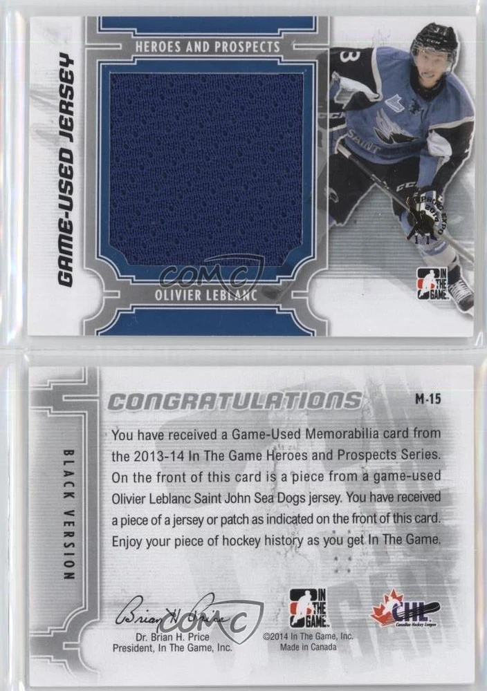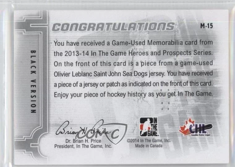 2013-14 In the Game Heroes and Prospects - Game-Used - Black Jersey 2014 Spring Expo #M-15 Olivier LeBlanc Serial #1/1 COMC Item: 49629977 - Rookie - Ice Hockey Card - Featuring the St. John Sea Dogs - Featuring Olivier LeBlanc Search for more: 2013-14 In the Game Heroes and Prospects Search for more: 2013-14 In the Game Heroes and Prospects - Game-Used - Black Jersey 2014 Spring Expo View all of our Listings Auctions Buy It Now About Us Located in the beautiful Pacific Northwest, COMC (Check Out My Cards) is the world's largest consignment service for trading card singles. More than 10,000 people have used our consignment service to list over 50 million trading cards. We currently house 20 million cards, each listed for sale with front and back images of the actual card. Find out how we can help you consign your items on eBay by contacting us through eBay messaging. COMC -- "The Safe & Easy Way to Buy & Sell" Raw Condition for Modern Cards Unless otherwise noted, raw modern cards are listed in Near Mint-Mint condition or better. A NM-MT card appears to be Mint at first glance, but upon closer inspection, may exhibit some of the following: minor print defects (e.g. roller marks, print line, dimple), minor scratches, slight edge wear, and slight corner wear. Centering is clearly visible in the images provided and does not factor into our condition assessment. Raw Condition for Vintage Cards Unless otherwise noted, raw vintage cards are listed in Excellent condition or better. An EX card may exhibit some of the following: minor rounding of corners, surface wear, print defects, light scratches, and slight edge wear/chipping. Centering is clearly visible in the images provided and does not factor into our condition assessment. Domestic Shipping Combined shipping for multiple items is available. To receive combined shipping, please ensure all desired items are in your eBay shopping cart before proceeding to checkout. eBay limits orders to 40 items per order. We automatically combine multiple orders placed on the same day. If you place multiple orders on the same day, please contact us to request a refund of applicable shipping costs. Signature confirmation may be required on invoices over $400. Raw cards are shipped in toploaders. International Shipping COMC offers eBay's International Shipping (EIS) for international orders under $2,500* (see country exceptions below). All duties and import fees are paid at checkout; in the rare event that there are additional import fees upon delivery, these are borne by the buyer. EIS packages route through a shipping hub in Erlanger, KY before shipping to their final destination. Please note that EIS does not allow for combined shipments. The shipping rates are determined by eBay and cannot be adjusted. *Maximum sale price exceptions: Colombia, Kuwait ($2,000); Taiwan ($1,539); Chile, Costa Rica, Guatemala, Honduras, Trinidad and Tobago ($1,000); Antigua and Barbuda, Aruba, Belize, Dominica, Grenada, Philippines, Saint Kitts and Nevis, Saint Lucia, Montserrat, Turks and Caicos Islands ($500); Dominican Republic, El Salvador ($200). Please request a shipping quote through eBay messaging for orders that exceed the maximum sale price supported by eBay's International Shipping. You will be responsible for all duties and import fees for international orders shipped outside the EIS. Raw cards are shipped in toploaders. Payment COMC does not accept offers on our cards through our eBay storefront. COMC utilizes eBay’s managed payments system. If you are experiencing difficulties making a payment, please contact eBay for assistance. Return Policy Returns are only accepted on the rare occasion the item is not as described. If you are making a return, please initiate the return process through eBay so a mailing label can be provided for you. Prior to listing, our expert team carefully assessed this item to represent it accurately. Please review the description and high-definition images prior to purchasing to ensure this item meets your satisfaction. We welcome you to contact us if you have further questions about this item. Trust and Integrity COMC carefully assesses each item consigned to us to prevent fraudulent items from entering the marketplace. If you believe an item offered on COMC may be fraudulent, please contact us with details so we can investigate the issue. Items we determine are outside our supported items policy may be removed. Last Modified: 1/16/2025 10:53:14 PM PDT