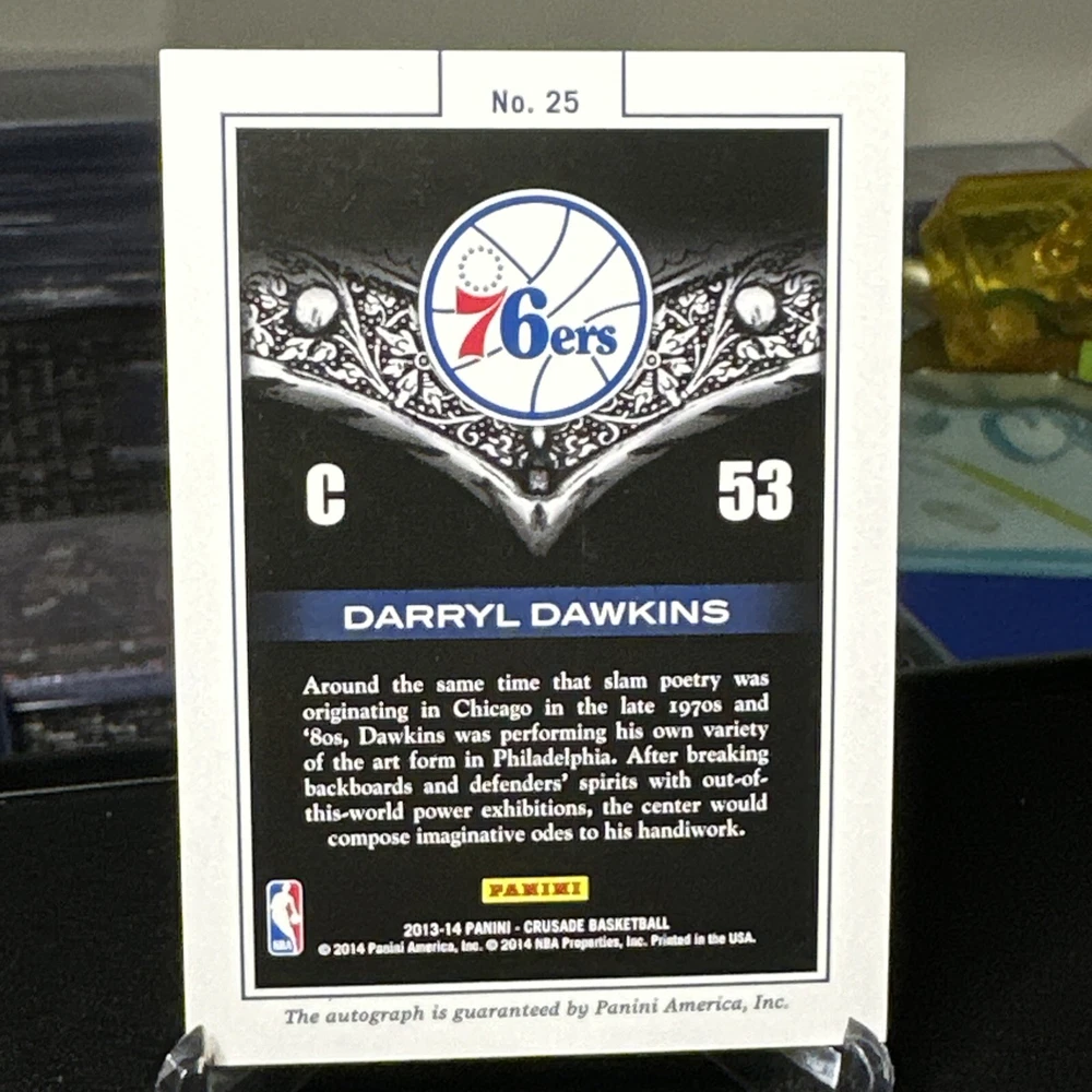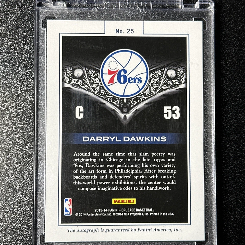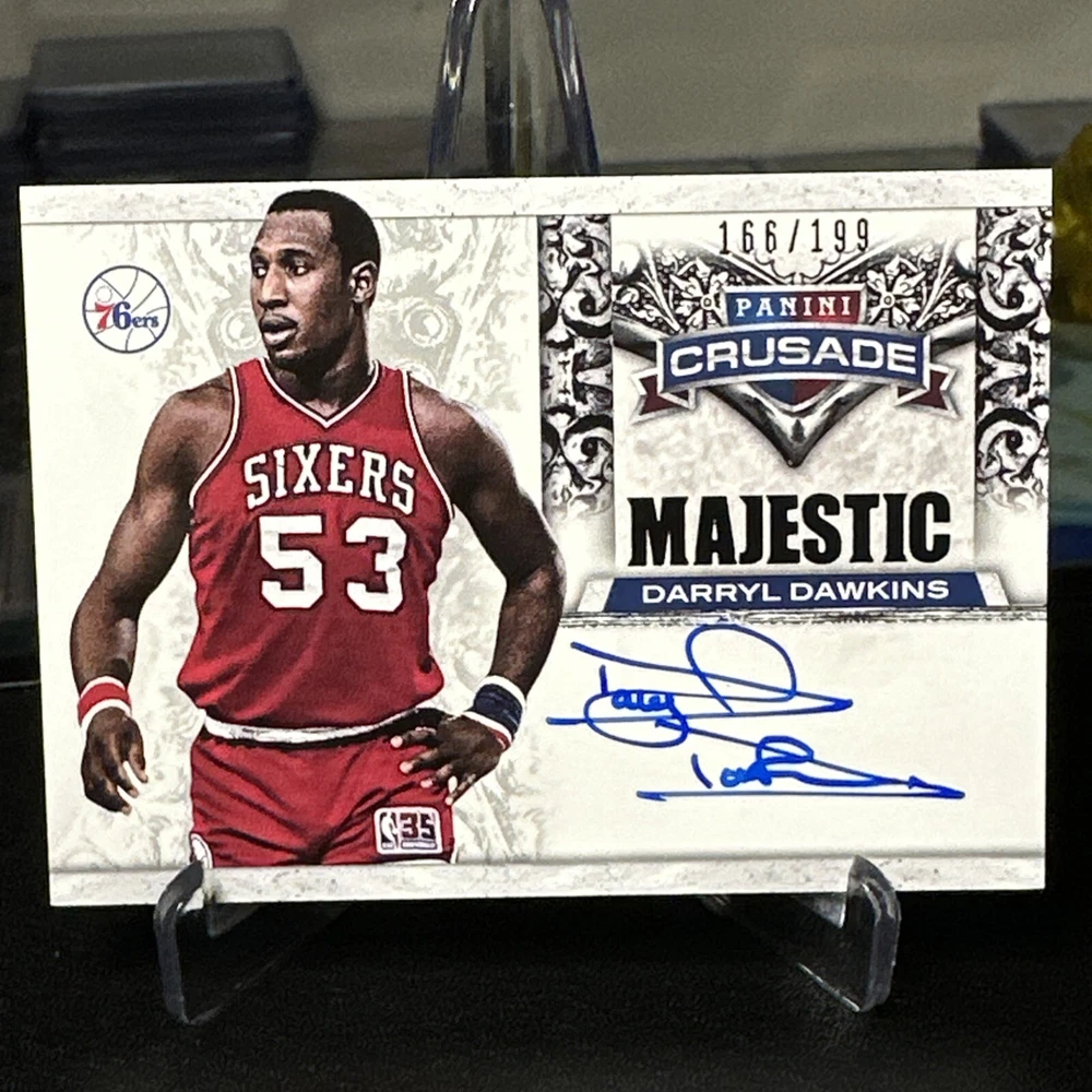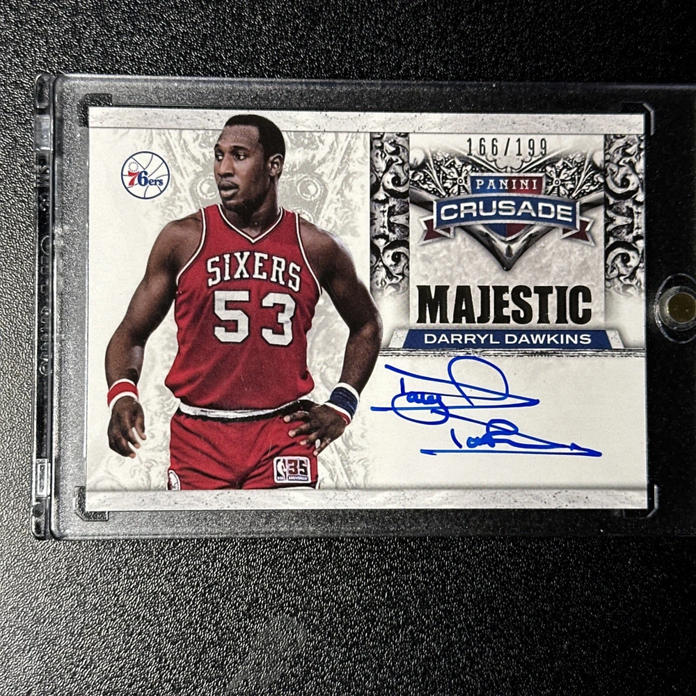 This rare 2013-14 Panini Crusade Majestic Autographs sports trading card features the legendary basketball player Darryl Dawkins of the Philadelphia 76ers. With a limited print run of only 199, this card is a must-have for any serious collector. The card is serial numbered, exclusive, and comes in a variety of features, including a checklist, collectors edition, and memorabilia. It is a parallel/variety of the Majestic Silver series and is part of the 2013-14 season. Don't miss your chance to own this incredible piece of basketball history. The card will ship in a penny sleeve, card saver, and mylar bag. It will be wrapped in bubble wrap and shipped in a bubble mailer as well. It will NOT ship in a one touch. The buyer pays for shipping. Card comes AS IT IS LISTED IN THE PICTURES!! Any other questions let me know and check out my other NBA auctions!
