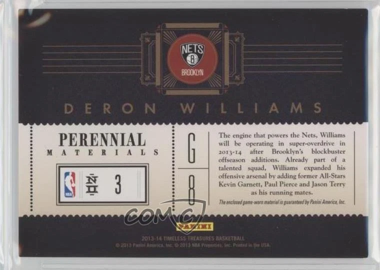 2013-14 Panini Timeless Treasures - Perennial Materials #3 Deron Williams - Basketball Card - Featuring the Brooklyn Nets - Featuring Deron Williams Search for more: 2013-14 Panini Timeless Treasures Search for more: 2013-14 Panini Timeless Treasures - Perennial Materials View all of our Listings Auctions Buy It Now About Us Located in the beautiful Pacific Northwest, COMC (Check Out My Cards) is the world's largest consignment service for trading card singles. More than 10,000 people have used our consignment service to list over 50 million trading cards. We currently house 20 million cards, each listed for sale with front and back images of the actual card. Find out how we can help you consign your items on eBay by contacting us through eBay messaging. COMC -- "The Safe & Easy Way to Buy & Sell" Representative Image - Select Specific Item above to see image of actual item Representative Image - Select Specific Item above to see image of actual item Raw Condition for Modern Cards Unless otherwise noted, raw modern cards are listed in Near Mint-Mint condition or better. A NM-MT card appears to be Mint at first glance, but upon closer inspection, may exhibit some of the following: minor print defects (e.g. roller marks, print line, dimple), minor scratches, slight edge wear, and slight corner wear. Centering is clearly visible in the images provided and does not factor into our condition assessment. Raw Condition for Vintage Cards Unless otherwise noted, raw vintage cards are listed in Excellent condition or better. An EX card may exhibit some of the following: minor rounding of corners, surface wear, print defects, light scratches, and slight edge wear/chipping. Centering is clearly visible in the images provided and does not factor into our condition assessment. Domestic Shipping Combined shipping for multiple items is available. To receive combined shipping, please ensure all desired items are in your eBay shopping cart before proceeding to checkout. eBay limits orders to 40 items per order. We automatically combine multiple orders placed on the same day. If you place multiple orders on the same day, please contact us to request a refund of applicable shipping costs. Signature confirmation may be required on invoices over $400. Raw cards are shipped in toploaders. International Shipping COMC offers eBay's International Shipping (EIS) for international orders under $2,500* (see country exceptions below). All duties and import fees are paid at checkout; in the rare event that there are additional import fees upon delivery, these are borne by the buyer. EIS packages route through a shipping hub in Erlanger, KY before shipping to their final destination. Please note that EIS does not allow for combined shipments. The shipping rates are determined by eBay and cannot be adjusted. *Maximum sale price exceptions: Colombia, Kuwait ($2,000); Taiwan ($1,539); Chile, Costa Rica, Guatemala, Honduras, Trinidad and Tobago ($1,000); Antigua and Barbuda, Aruba, Belize, Dominica, Grenada, Philippines, Saint Kitts and Nevis, Saint Lucia, Montserrat, Turks and Caicos Islands ($500); Dominican Republic, El Salvador ($200). Please request a shipping quote through eBay messaging for orders that exceed the maximum sale price supported by eBay's International Shipping. You will be responsible for all duties and import fees for international orders shipped outside the EIS. Raw cards are shipped in toploaders. Payment COMC does not accept offers on our cards through our eBay storefront. COMC utilizes eBay’s managed payments system. If you are experiencing difficulties making a payment, please contact eBay for assistance. Return Policy Returns are only accepted on the rare occasion the item is not as described. If you are making a return, please initiate the return process through eBay so a mailing label can be provided for you. Prior to listing, our expert team carefully assessed this item to represent it accurately. Please review the description and high-definition images prior to purchasing to ensure this item meets your satisfaction. We welcome you to contact us if you have further questions about this item. Trust and Integrity COMC carefully assesses each item consigned to us to prevent fraudulent items from entering the marketplace. If you believe an item offered on COMC may be fraudulent, please contact us with details so we can investigate the issue. Items we determine are outside our supported items policy may be removed. Last Modified: 1/16/2025 10:30:09 PM PDT
