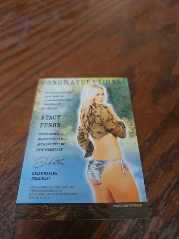 2014 Benchwarmer Treasure Chest Autograph Gold Foil Card Stacy Fuson Auto Playboy Tall (5' 9"), busty, and shapely blonde bombshell Stacy Marie Fuson was born on August 30, 1978 in Tacoma, Washington. She has an older brother named Doug. Fuson played baseball, bowling, and volleyball growing up as a kid. Stacy stopped participating in sports in her freshman year of high school and starting focusing more on modeling (she was featured in the "Teen" Great Model Search in the magazine's October, 1993 issue). After graduating from high school in 1996, Fuson moved to Los Angeles, California at age eighteen to further pursue her modeling career and worked at the Limited. She graced the cover of the October, 1997 issue of "Playboy" and was the Playmate of the Month for the February, 1999 issue of "Playboy." Moreover, Fuson has had guest roles on episodes of such TV series as "Entourage" and "Modern Family." Among the movies she has acted in are "The Independent," "Shallow Hal," and "Room 6." Stacy was the 2005 St. Pauli Girl. She's a news anchor for FoxxyNews.com. Please, look at all the pictures. Please check out my other eBay accounts... https://www.ebay.com/usr/kimmyrael https://www.ebay.com/usr/matlac99 https://www.ebay.com/usr/lacr6837 https://www.ebay.com/usr/malac9440 https://www.ebay.com/usr/lacr_3567 https://www.ebay.com/usr/lacroki8 https://www.ebay.com/usr/lacroki9 Shipping only to the continental US unless you contact me first. Will combine shipping!!!