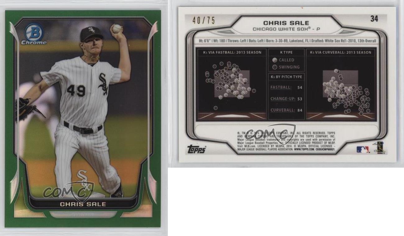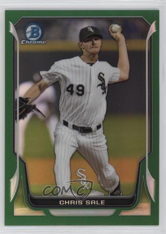 2014 Bowman Chrome - [Base] - Green Refractor #34 Chris Sale Qty Made: 75 - Baseball Card - Featuring the Chicago White Sox - Featuring Chris Sale Search for more: 2014 Bowman Chrome Search for more: 2014 Bowman Chrome - [Base] - Green Refractor View all of our Listings Auctions Buy It Now About Us Located in the beautiful Pacific Northwest, COMC (Check Out My Cards) is the world's largest consignment service for trading card singles. More than 10,000 people have used our consignment service to list over 50 million trading cards. Find out how we can help you consign your items on eBay by contacting us through eBay messaging. COMC -- "The Safe & Easy Way to Buy & Sell" Representative Image - Select Specific Item above to see image of actual item Representative Image - Select Specific Item above to see image of actual item Raw Condition for Modern Cards Unless otherwise noted, raw modern cards are listed in Near Mint-Mint condition or better. A NM-MT card appears to be Mint at first glance, but upon closer inspection, may exhibit some of the following: minor print defects (e.g. roller marks, print line, dimple), minor scratches, slight edge wear, and slight corner wear. Centering is clearly visible in the images provided and does not factor into our condition assessment. Raw Condition for Vintage Cards Unless otherwise noted, raw vintage cards are listed in Excellent condition or better. An EX card may exhibit some of the following: minor rounding of corners, surface wear, print defects, light scratches, and slight edge wear/chipping. Centering is clearly visible in the images provided and does not factor into our condition assessment. Domestic Shipping Combined shipping for multiple items is available. To receive combined shipping, please ensure all desired items are in your eBay shopping cart before proceeding to checkout. eBay limits orders to 40 items per order. We automatically combine multiple orders placed on the same day. If you place multiple orders on the same day, please contact us to request a refund of applicable shipping costs. Signature confirmation may be required on invoices over $400. All cards are protected and shipped securely. International Shipping COMC offers eBay's International Shipping (EIS) for international orders under $2,500* (see country exceptions below). All duties and import fees are paid at checkout; in the rare event that there are additional import fees upon delivery, these are borne by the buyer. EIS packages route through a shipping hub in Erlanger, KY before shipping to their final destination. Please note that EIS does not allow for combined shipments. The shipping rates are determined by eBay and cannot be adjusted. *Maximum sale price exceptions: Colombia, Kuwait ($2,000); Taiwan ($1,539); Chile, Costa Rica, Guatemala, Honduras, Trinidad and Tobago ($1,000); Antigua and Barbuda, Aruba, Belize, Dominica, Grenada, Philippines, Saint Kitts and Nevis, Saint Lucia, Montserrat, Turks and Caicos Islands ($500); Dominican Republic, El Salvador ($200). Please request a shipping quote through eBay messaging for orders that exceed the maximum sale price supported by eBay's International Shipping. You will be responsible for all duties and import fees for international orders shipped outside the EIS. All cards are protected and shipped securely. Payment COMC does not accept offers on our cards through our eBay storefront. COMC utilizes eBay’s managed payments system. If you are experiencing difficulties making a payment, please contact eBay for assistance. Return Policy Returns are only accepted on the rare occasion the item is not as described. If you are making a return, please initiate the return process through eBay so a mailing label can be provided for you. Prior to listing, our expert team carefully assessed this item to represent it accurately. Please review the description and high-definition images prior to purchasing to ensure this item meets your satisfaction. We welcome you to contact us if you have further questions about this item. Trust and Integrity COMC carefully assesses each item consigned to us to prevent fraudulent items from entering the marketplace. If you believe an item offered on COMC may be fraudulent, please contact us with details so we can investigate the issue. Items we determine are outside our supported items policy may be removed. Last Modified: 5/15/2025 8:16:36 PM PDT
