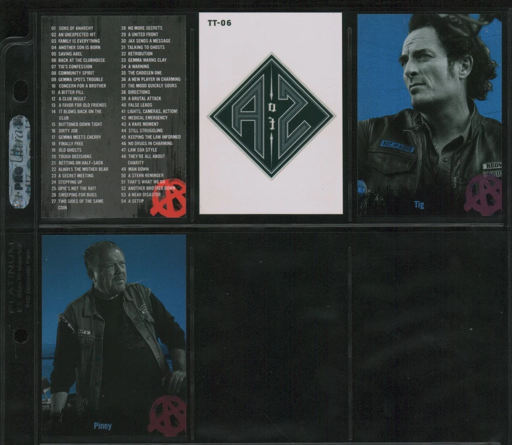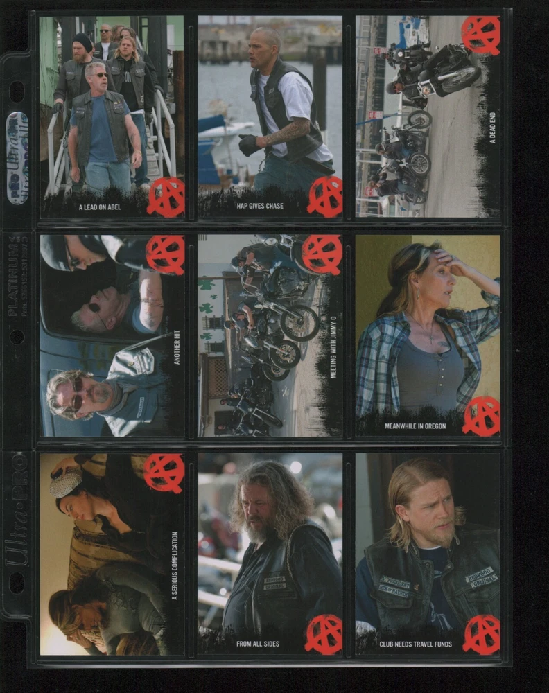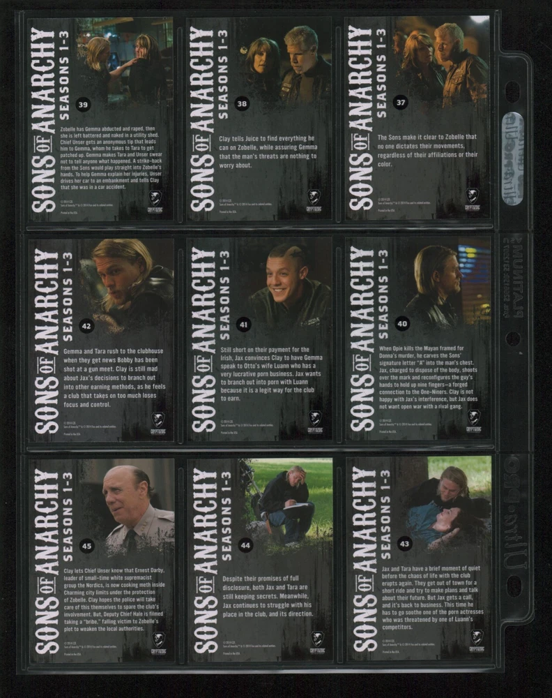 ITEM DESCRIPTION : 2014 Cryptozoic Sons of Anarchy Seasons 1-3 Base Set 1-100 + Character Bios #C05 & #C09 + Temporary Tattoo #TT-06 . See photos for details. IMAGINAIRE STORE: Formerly Simon Bourque Sports Cards. Since 1988, Imaginaire specializes in trading cards, stamps, collectibles, and memorabilia . SHIPPING COSTS: Combine items and save on shipping costs. Price varies depending on the size and weight of the parcel. Please note that all packages over $100 will be automatically sent via registered postal service with tracking number. NOTICE INFORMATION: PLEASE NOTE that p ayment must be received within 7 business days of the end of auction, unless prior arrangements have been made. Item(s) will be shipped within 2 business days. If you have any questions, please email us.