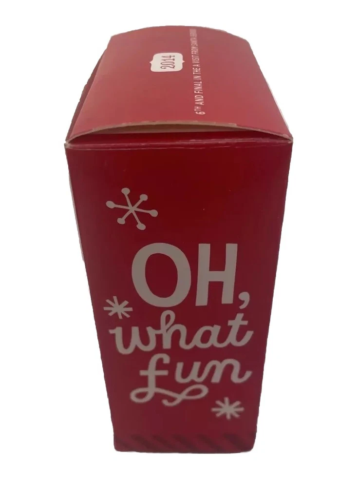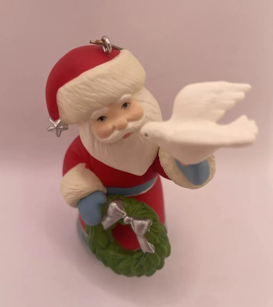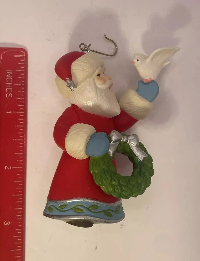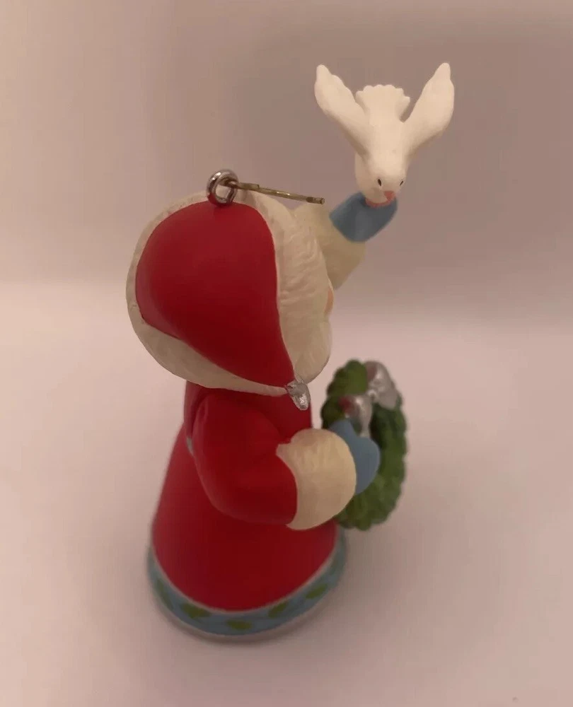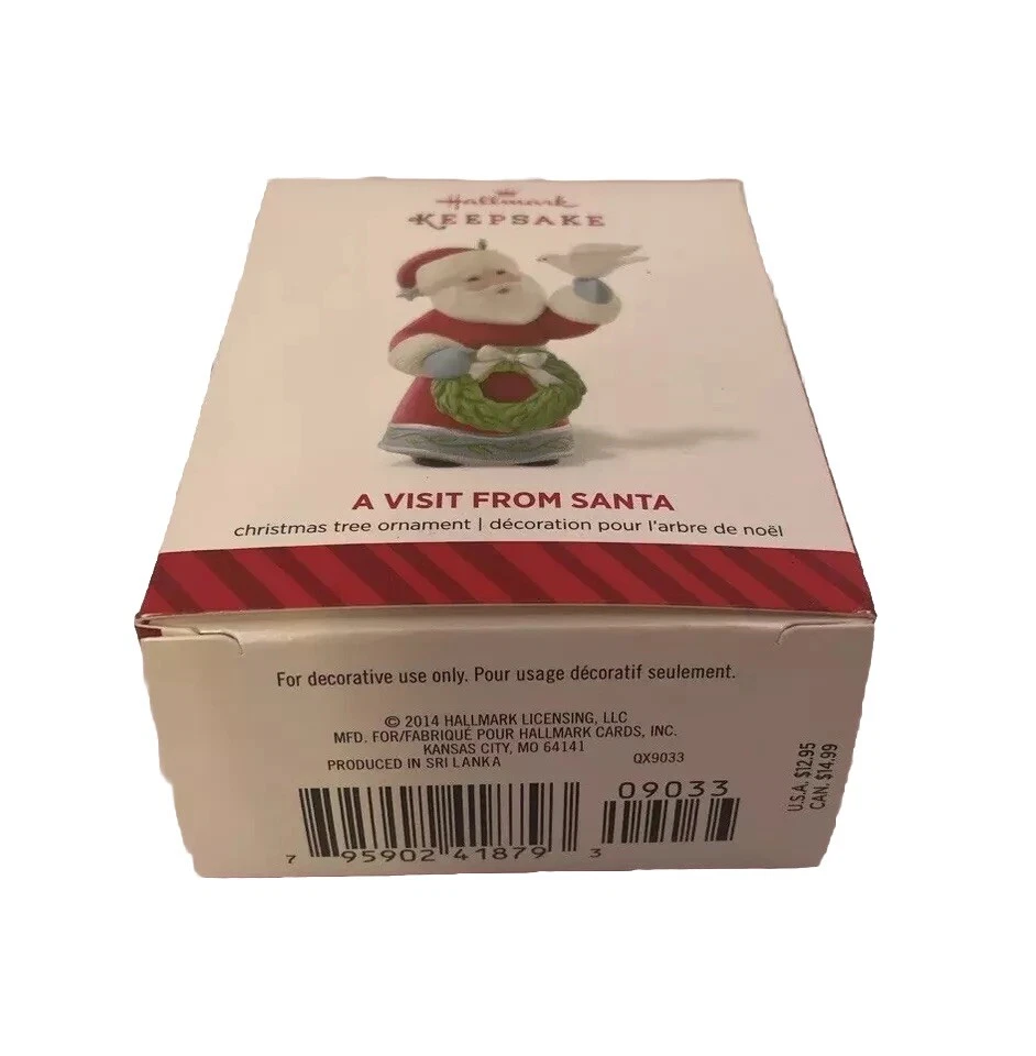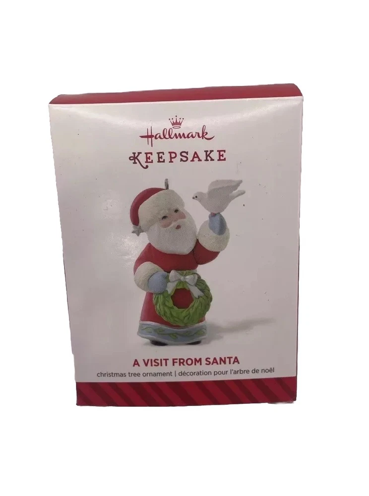 Celebrate the holiday season with this beautiful 2014 Hallmark Keepsake Ornament. The ornament features a visit from Santa, portrayed in stunning multicolor detail. Perfect for adding to your ornament collection or gifting to a loved one, this hanging ornament is part of the 6th in Series Wreath Dove collection. Crafted with care and attention to detail, this ornament is sure to bring joy and wonder to your Christmas tree. Whether you're a collector or just looking for a special ornament to cherish, this piece is a must-have. Don't miss out on the chance to add this stunning ornament to your holiday decor.