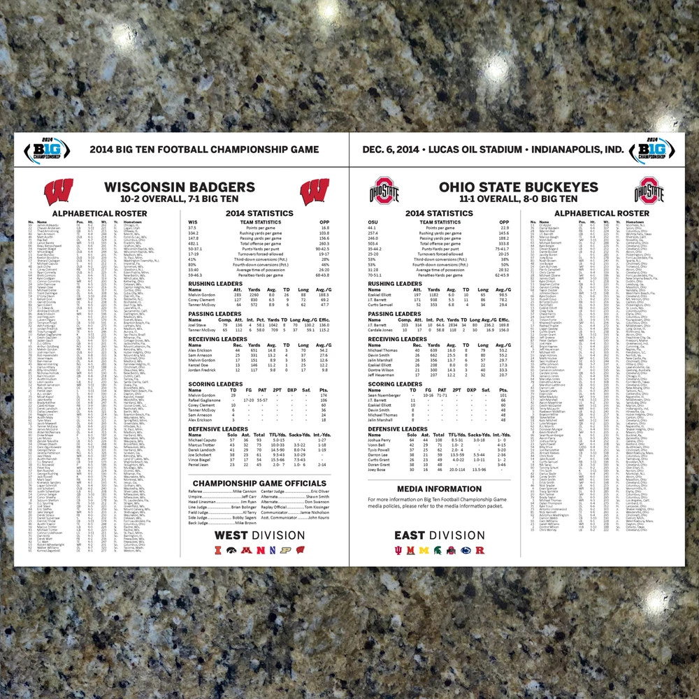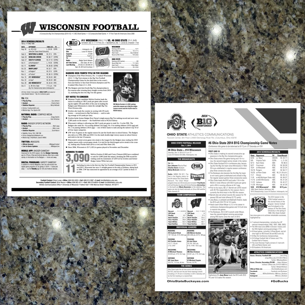 For sale, the game issued Flipcard, Media Program Notes from the 2014 Ohio State vs. Wisconsin Big 10 Championship game on December 6, 2014. In the Big Ten Championship Game, Ohio State dominated with a 59-0 victory, impressing the CFP committee and securing a playoff berth. History! Game: 2014 Big 10 Championship Teams: Ohio State vs Wisconsin Date: December 6, 2014 Stadium: LUCAS OIL STADIUM Location: INDIANAPOLIS, IND. What you get: 1. 11x17 Game Issued Media Issued Flipcard - Ohio State vs Wisconsin 2. Ohio State Media Program Game Note (1-page) 3. Wisconsin Media Program Game Note (1-page) 4. Plastic protector sheet