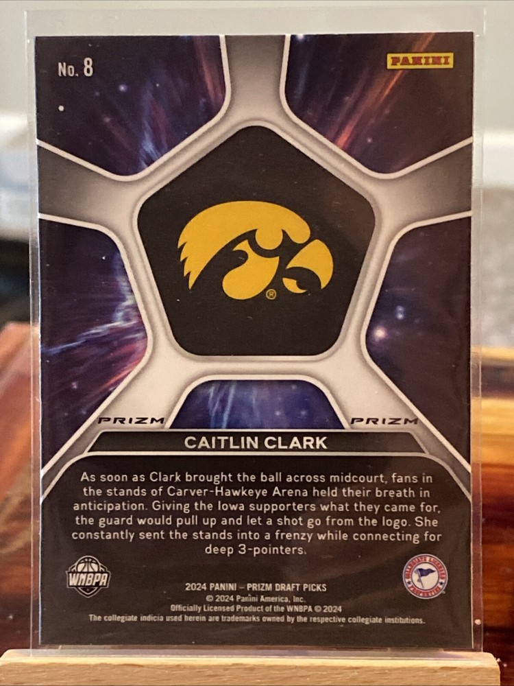 The product is a 2014 Prizm Draft basketball trading card featuring rookie athlete Caitlin Clark. It is a Silver Prizm parallel variety card from the Deep Space series. This sports trading card is a collectible item that showcases Caitlin Clark in her early years as a basketball player.