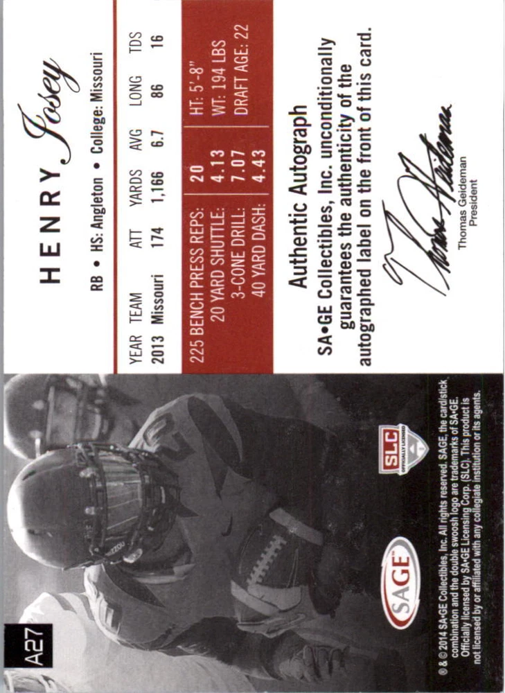 2014 SAGE Autographs Silver #27 Henry Josey Auto /99 - NM-MT Front Back Sport: Football Set: 2014 SAGE Autographs Silver Year: 2014 Item#: 27 Player: Henry Josey Attributes: Autograph, Serial Numbered Brand: SAGE Manufacturer: SAGE Grading Company: Raw Grade SetType: Main Item Condition: Near Mint/Mint 2014 Beckett Collectibles, LLC. All Rights Reserved Powered by: All orders are shipped in a minimum of a bubble mailer with a box for larger orders or orders with graded cards. All domestic orders are shipped with delivery confirmation. Listings may have stock photos. If the title & the picture do not match. It is probably an error in the picture, PLEASE ASK BEFORE YOU BUY to make sure. If the card is serial numbered, it may no longer match the one pictured, as we have literally millions of cards. ASK before you buy if there are ANY questions. We combine shipping. For normal sized/thickness cards, we ship up to 20 for the $4 fee. Odd-sized, thicker and graded cards may be more expensive. Domestic S&H is $4 for first class mail Graded or Uncirculated cards may be more to ship. We are no longer shipping international orders. If you live outside the United States and wish to place an order, please set up an account with one of the international drop shipping companies or one of the companies in the U.S. that will warehouse your items for you.