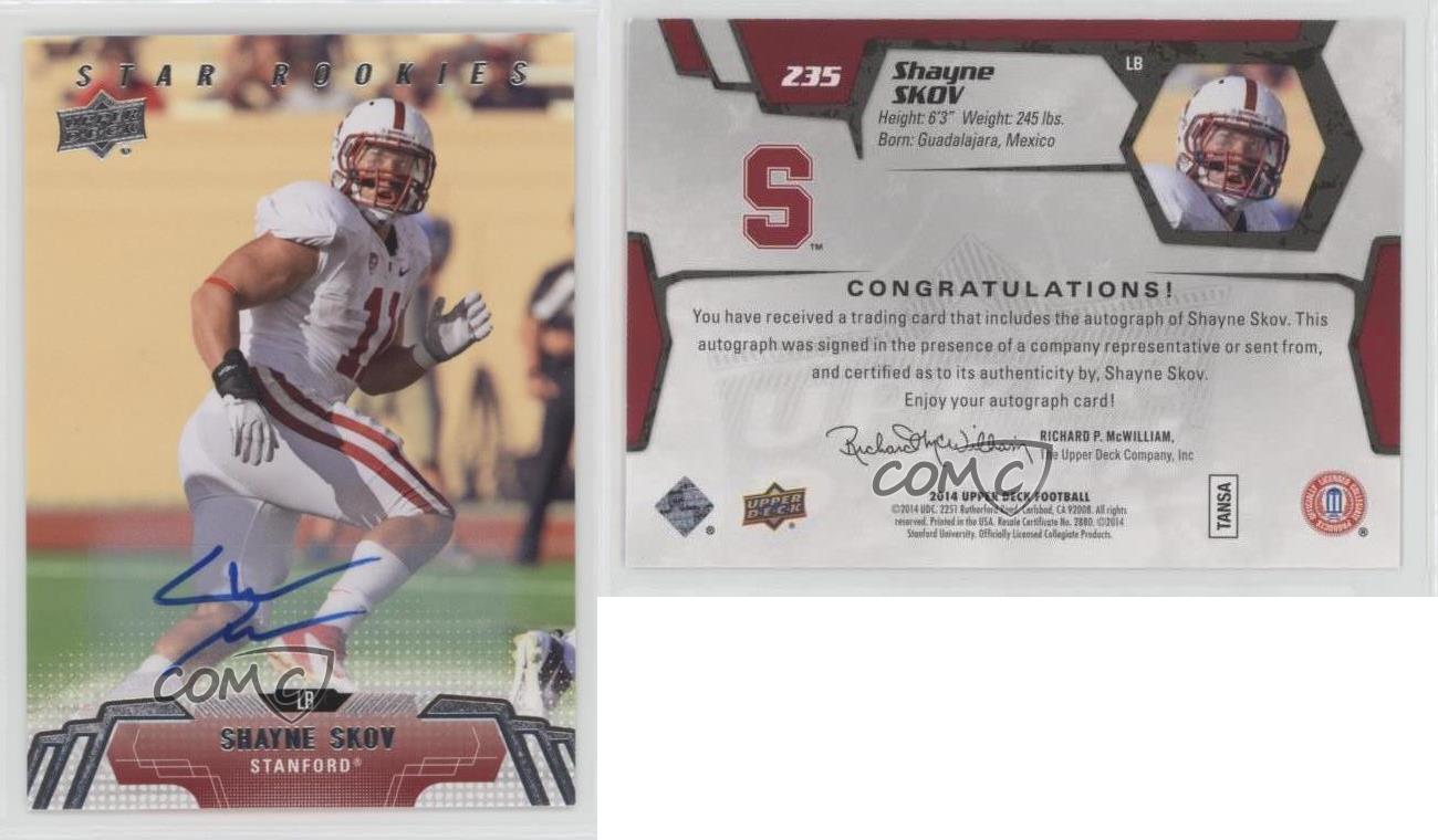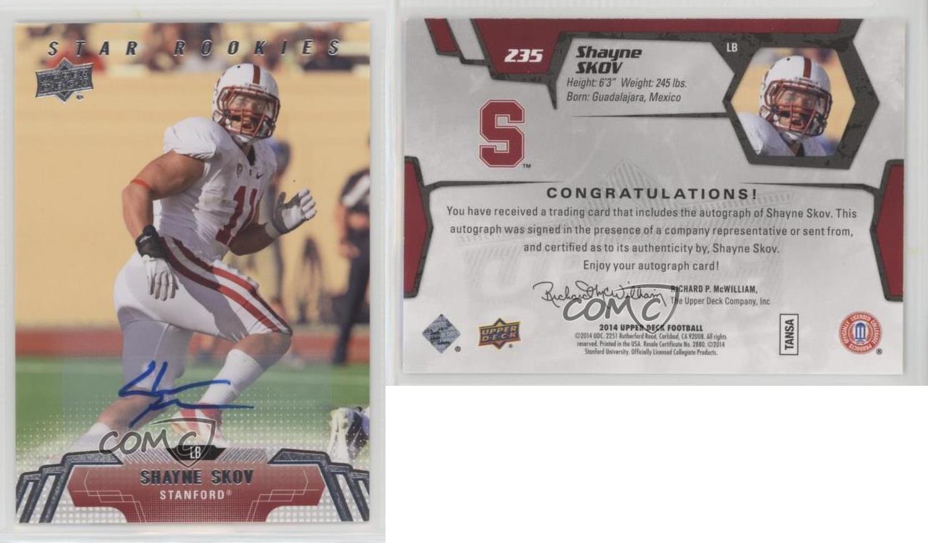 2014 Upper Deck - [Base] - Autographs #235 Star Rookies - Shayne Skov - Rookie - Football Card - Featuring the Stanford Cardinal - Featuring Shayne Skov Search for more: 2014 Upper Deck Search for more: 2014 Upper Deck - [Base] - Autographs View all of our Listings Auctions Buy It Now About Us Located in the beautiful Pacific Northwest, COMC (Check Out My Cards) is the world's largest consignment service for trading card singles. More than 10,000 people have used our consignment service to list over 50 million trading cards. We currently house 20 million cards, each listed for sale with front and back images of the actual card. Find out how we can help you consign your items on eBay by contacting us through eBay messaging. COMC -- "The Safe & Easy Way to Buy & Sell" Representative Image - Select Specific Item above to see image of actual item Representative Image - Select Specific Item above to see image of actual item Raw Condition for Modern Cards Unless otherwise noted, raw modern cards are listed in Near Mint-Mint condition or better. A NM-MT card appears to be Mint at first glance, but upon closer inspection, may exhibit some of the following: minor print defects (e.g. roller marks, print line, dimple), minor scratches, slight edge wear, and slight corner wear. Centering is clearly visible in the images provided and does not factor into our condition assessment. Raw Condition for Vintage Cards Unless otherwise noted, raw vintage cards are listed in Excellent condition or better. An EX card may exhibit some of the following: minor rounding of corners, surface wear, print defects, light scratches, and slight edge wear/chipping. Centering is clearly visible in the images provided and does not factor into our condition assessment. Domestic Shipping Combined shipping for multiple items is available. To receive combined shipping, please ensure all desired items are in your eBay shopping cart before proceeding to checkout. eBay limits orders to 40 items per order. We automatically combine multiple orders placed on the same day. If you place multiple orders on the same day, please contact us to request a refund of applicable shipping costs. Signature confirmation may be required on invoices over $400. Raw cards are shipped in toploaders. International Shipping COMC offers eBay's International Shipping (EIS) for international orders under $2,500* (see country exceptions below). All duties and import fees are paid at checkout; in the rare event that there are additional import fees upon delivery, these are borne by the buyer. EIS packages route through a shipping hub in Erlanger, KY before shipping to their final destination. Please note that EIS does not allow for combined shipments. The shipping rates are determined by eBay and cannot be adjusted. *Maximum sale price exceptions: Colombia, Kuwait ($2,000); Taiwan ($1,539); Chile, Costa Rica, Guatemala, Honduras, Trinidad and Tobago ($1,000); Antigua and Barbuda, Aruba, Belize, Dominica, Grenada, Philippines, Saint Kitts and Nevis, Saint Lucia, Montserrat, Turks and Caicos Islands ($500); Dominican Republic, El Salvador ($200). Please request a shipping quote through eBay messaging for orders that exceed the maximum sale price supported by eBay's International Shipping. You will be responsible for all duties and import fees for international orders shipped outside the EIS. Raw cards are shipped in toploaders. Payment COMC does not accept offers on our cards through our eBay storefront. COMC utilizes eBay’s managed payments system. If you are experiencing difficulties making a payment, please contact eBay for assistance. Return Policy Returns are only accepted on the rare occasion the item is not as described. If you are making a return, please initiate the return process through eBay so a mailing label can be provided for you. Prior to listing, our expert team carefully assessed this item to represent it accurately. Please review the description and high-definition images prior to purchasing to ensure this item meets your satisfaction. We welcome you to contact us if you have further questions about this item. Trust and Integrity COMC carefully assesses each item consigned to us to prevent fraudulent items from entering the marketplace. If you believe an item offered on COMC may be fraudulent, please contact us with details so we can investigate the issue. Items we determine are outside our supported items policy may be removed. Last Modified: 12/24/2024 10:55:07 PM PDT