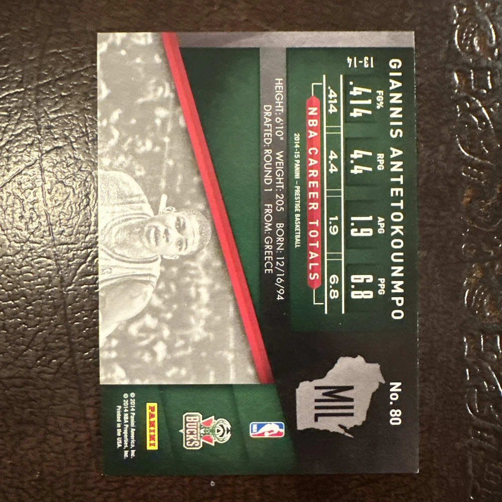 Card Number: 80 Parallel/Variety: Red Foil Features: Short Print Season: 2014-15 Language: English Original/Licensed Reprint: Original Country/Region of Manufacture: United States Sport: Basketball Player/Athlete: Giannis Antetokounmpo Team: Milwaukee Bucks Manufacturer: Panini Player: Giannis Antetokounmpo Type: Sports Trading Card Vintage: No League: National Basketball Association (NBA)