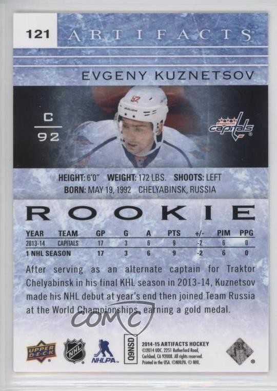 2014-15 Upper Deck Artifacts - [Base] - Ruby #121 Rookies - Evgeny Kuznetsov Qty Made: 499 - RC (Rookie Card) - Ice Hockey Card - Featuring the Washington Capitals - Featuring Evgeny Kuznetsov Search for more: 2014-15 Upper Deck Artifacts Search for more: 2014-15 Upper Deck Artifacts - [Base] - Ruby View all of our Listings Auctions Buy It Now About Us Located in the beautiful Pacific Northwest, COMC (Check Out My Cards) is the world's largest consignment service for trading card singles. More than 10,000 people have used our consignment service to list over 50 million trading cards. Find out how we can help you consign your items on eBay by contacting us through eBay messaging. COMC -- "The Safe & Easy Way to Buy & Sell" Representative Image - Select Specific Item above to see image of actual item Representative Image - Select Specific Item above to see image of actual item Raw Condition for Modern Cards Unless otherwise noted, raw modern cards are listed in Near Mint-Mint condition or better. A NM-MT card appears to be Mint at first glance, but upon closer inspection, may exhibit some of the following: minor print defects (e.g. roller marks, print line, dimple), minor scratches, slight edge wear, and slight corner wear. Centering is clearly visible in the images provided and does not factor into our condition assessment. Raw Condition for Vintage Cards Unless otherwise noted, raw vintage cards are listed in Excellent condition or better. An EX card may exhibit some of the following: minor rounding of corners, surface wear, print defects, light scratches, and slight edge wear/chipping. Centering is clearly visible in the images provided and does not factor into our condition assessment. Domestic Shipping Combined shipping for multiple items is available. To receive combined shipping, please ensure all desired items are in your eBay shopping cart before proceeding to checkout. eBay limits orders to 40 items per order. We automatically combine multiple orders placed on the same day. If you place multiple orders on the same day, please contact us to request a refund of applicable shipping costs. Signature confirmation may be required on invoices over $400. All cards are protected and shipped securely. International Shipping COMC offers eBay's International Shipping (EIS) for international orders under $2,500* (see country exceptions below). All duties and import fees are paid at checkout; in the rare event that there are additional import fees upon delivery, these are borne by the buyer. EIS packages route through a shipping hub in Erlanger, KY before shipping to their final destination. Please note that EIS does not allow for combined shipments. The shipping rates are determined by eBay and cannot be adjusted. *Maximum sale price exceptions: Colombia, Kuwait ($2,000); Taiwan ($1,539); Chile, Costa Rica, Guatemala, Honduras, Trinidad and Tobago ($1,000); Antigua and Barbuda, Aruba, Belize, Dominica, Grenada, Philippines, Saint Kitts and Nevis, Saint Lucia, Montserrat, Turks and Caicos Islands ($500); Dominican Republic, El Salvador ($200). Please request a shipping quote through eBay messaging for orders that exceed the maximum sale price supported by eBay's International Shipping. You will be responsible for all duties and import fees for international orders shipped outside the EIS. All cards are protected and shipped securely. Payment COMC does not accept offers on our cards through our eBay storefront. COMC utilizes eBay’s managed payments system. If you are experiencing difficulties making a payment, please contact eBay for assistance. Return Policy Returns are only accepted on the rare occasion the item is not as described. If you are making a return, please initiate the return process through eBay so a mailing label can be provided for you. Prior to listing, our expert team carefully assessed this item to represent it accurately. Please review the description and high-definition images prior to purchasing to ensure this item meets your satisfaction. We welcome you to contact us if you have further questions about this item. Trust and Integrity COMC carefully assesses each item consigned to us to prevent fraudulent items from entering the marketplace. If you believe an item offered on COMC may be fraudulent, please contact us with details so we can investigate the issue. Items we determine are outside our supported items policy may be removed. Last Modified: 7/4/2025 3:10:05 PM PDT