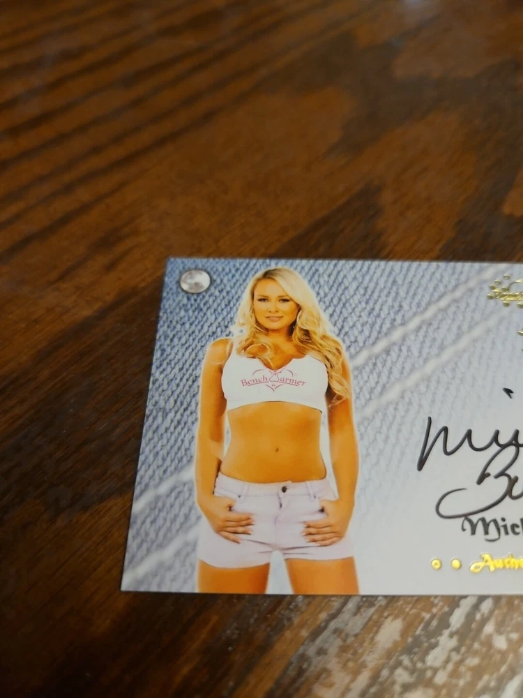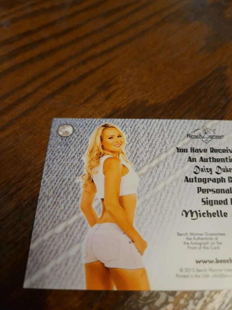 2015 Benchwarmer Daizy Dukez Autograph Gold Foil Card Michelle Baena Auto Playboy Busty, shapely, and enticing blonde 5'3" bombshell Michelle Marie Baena was born on December 24, 1972 in Muncie, Indiana. Michelle had to travel a lot as a kid because of her father's career: She attended elementary school in Edmond, Oklahoma; resided in Folsom, California in the fifth grade, and lived in Stanley, Kansas when she was in the eighth grade. Baena moved to California at age seventeen. In August, 2004 Michelle decided to pursue a modeling career at age thirty-one. Baena came in fourth place in the Bay City Area Hawaiian Tropic contest. She sent several photos of herself to Playboy.com and was chosen be both grace the cover of and do a pictorial in the May, 2005 issue of the famous men's magazine. Michelle has subsequently gone on to model for Mystique, Mac & Bumble, the USA National Bikini Team, and Benchwarmer Trading Cards. Moreover, Baena has posed for pictorials in such publications as "American Curves," "Rockstar," and "Skateboarder." Michelle lives in California with her husband Mark Beana and three children. Please, look at all the pictures. Please check out my other eBay accounts... https://www.ebay.com/usr/kimmyrael https://www.ebay.com/usr/matlac99 https://www.ebay.com/usr/lacr6837 https://www.ebay.com/usr/malac9440 https://www.ebay.com/usr/lacr_3567 https://www.ebay.com/usr/lacroki8 https://www.ebay.com/usr/lacroki9 Shipping only to the continental US unless you contact me first. Will combine shipping!!!