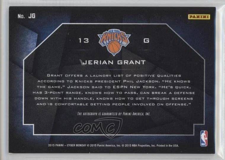 2015 Panini Cyber Monday - Autographed Manufactured Patch - Panini Logo #JG Jerian Grant - Rookie - MultiSport Card - Featuring the New York Knicks - Featuring Jerian Grant Search for more: 2015 Panini Cyber Monday Search for more: 2015 Panini Cyber Monday - Autographed Manufactured Patch - Panini Logo View all of our Listings Auctions Buy It Now About Us Located in the beautiful Pacific Northwest, COMC (Check Out My Cards) is the world's largest consignment service for trading card singles. More than 10,000 people have used our consignment service to list over 50 million trading cards. Find out how we can help you consign your items on eBay by contacting us through eBay messaging. COMC -- "The Safe & Easy Way to Buy & Sell" Representative Image - Select Specific Item above to see image of actual item Representative Image - Select Specific Item above to see image of actual item Raw Condition for Modern Cards Unless otherwise noted, raw modern cards are listed in Near Mint-Mint condition or better. A NM-MT card appears to be Mint at first glance, but upon closer inspection, may exhibit some of the following: minor print defects (e.g. roller marks, print line, dimple), minor scratches, slight edge wear, and slight corner wear. Centering is clearly visible in the images provided and does not factor into our condition assessment. Raw Condition for Vintage Cards Unless otherwise noted, raw vintage cards are listed in Excellent condition or better. An EX card may exhibit some of the following: minor rounding of corners, surface wear, print defects, light scratches, and slight edge wear/chipping. Centering is clearly visible in the images provided and does not factor into our condition assessment. Domestic Shipping Combined shipping for multiple items is available. To receive combined shipping, please ensure all desired items are in your eBay shopping cart before proceeding to checkout. eBay limits orders to 40 items per order. We automatically combine multiple orders placed on the same day. If you place multiple orders on the same day, please contact us to request a refund of applicable shipping costs. Signature confirmation may be required on invoices over $400. All cards are protected and shipped securely. International Shipping COMC offers eBay's International Shipping (EIS) for international orders under $2,500* (see country exceptions below). All duties and import fees are paid at checkout; in the rare event that there are additional import fees upon delivery, these are borne by the buyer. EIS packages route through a shipping hub in Erlanger, KY before shipping to their final destination. Please note that EIS does not allow for combined shipments. The shipping rates are determined by eBay and cannot be adjusted. *Maximum sale price exceptions: Colombia, Kuwait ($2,000); Taiwan ($1,539); Chile, Costa Rica, Guatemala, Honduras, Trinidad and Tobago ($1,000); Antigua and Barbuda, Aruba, Belize, Dominica, Grenada, Philippines, Saint Kitts and Nevis, Saint Lucia, Montserrat, Turks and Caicos Islands ($500); Dominican Republic, El Salvador ($200). Please request a shipping quote through eBay messaging for orders that exceed the maximum sale price supported by eBay's International Shipping. You will be responsible for all duties and import fees for international orders shipped outside the EIS. All cards are protected and shipped securely. Payment COMC does not accept offers on our cards through our eBay storefront. COMC utilizes eBay’s managed payments system. If you are experiencing difficulties making a payment, please contact eBay for assistance. Return Policy Returns are only accepted on the rare occasion the item is not as described. If you are making a return, please initiate the return process through eBay so a mailing label can be provided for you. Prior to listing, our expert team carefully assessed this item to represent it accurately. Please review the description and high-definition images prior to purchasing to ensure this item meets your satisfaction. We welcome you to contact us if you have further questions about this item. Trust and Integrity COMC carefully assesses each item consigned to us to prevent fraudulent items from entering the marketplace. If you believe an item offered on COMC may be fraudulent, please contact us with details so we can investigate the issue. Items we determine are outside our supported items policy may be removed. Last Modified: 1/30/2025 11:52:23 AM PDT