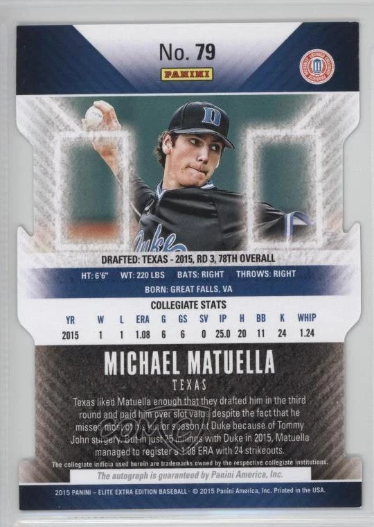 2015 Panini Elite Extra Edition - [Base] - Status Purple Die-Cut Prospects Autographs #79 Michael Matuella Qty Made: 75 - Rookie - Baseball Card - Featuring the Texas Rangers - Featuring Michael Matuella Search for more: 2015 Panini Elite Extra Edition Search for more: 2015 Panini Elite Extra Edition - [Base] - Status Purple Die-Cut Prospects Autographs View all of our Listings Auctions Buy It Now About Us Located in the beautiful Pacific Northwest, COMC (Check Out My Cards) is the world's largest consignment service for trading card singles. More than 10,000 people have used our consignment service to list over 50 million trading cards. We currently house 20 million cards, each listed for sale with front and back images of the actual card. Find out how we can help you consign your items on eBay by contacting us through eBay messaging. COMC -- "The Safe & Easy Way to Buy & Sell" Representative Image - Select Specific Item above to see image of actual item Representative Image - Select Specific Item above to see image of actual item Raw Condition for Modern Cards Unless otherwise noted, raw modern cards are listed in Near Mint-Mint condition or better. A NM-MT card appears to be Mint at first glance, but upon closer inspection, may exhibit some of the following: minor print defects (e.g. roller marks, print line, dimple), minor scratches, slight edge wear, and slight corner wear. Centering is clearly visible in the images provided and does not factor into our condition assessment. Raw Condition for Vintage Cards Unless otherwise noted, raw vintage cards are listed in Excellent condition or better. An EX card may exhibit some of the following: minor rounding of corners, surface wear, print defects, light scratches, and slight edge wear/chipping. Centering is clearly visible in the images provided and does not factor into our condition assessment. Domestic Shipping Combined shipping for multiple items is available. To receive combined shipping, please ensure all desired items are in your eBay shopping cart before proceeding to checkout. eBay limits orders to 40 items per order. We automatically combine multiple orders placed on the same day. If you place multiple orders on the same day, please contact us to request a refund of applicable shipping costs. Signature confirmation may be required on invoices over $400. Raw cards are shipped in toploaders. International Shipping COMC offers eBay's International Shipping (EIS) for international orders under $2,500* (see country exceptions below). All duties and import fees are paid at checkout; in the rare event that there are additional import fees upon delivery, these are borne by the buyer. EIS packages route through a shipping hub in Erlanger, KY before shipping to their final destination. Please note that EIS does not allow for combined shipments. The shipping rates are determined by eBay and cannot be adjusted. *Maximum sale price exceptions: Colombia, Kuwait ($2,000); Taiwan ($1,539); Chile, Costa Rica, Guatemala, Honduras, Trinidad and Tobago ($1,000); Antigua and Barbuda, Aruba, Belize, Dominica, Grenada, Philippines, Saint Kitts and Nevis, Saint Lucia, Montserrat, Turks and Caicos Islands ($500); Dominican Republic, El Salvador ($200). Please request a shipping quote through eBay messaging for orders that exceed the maximum sale price supported by eBay's International Shipping. You will be responsible for all duties and import fees for international orders shipped outside the EIS. Raw cards are shipped in toploaders. Payment COMC does not accept offers on our cards through our eBay storefront. COMC utilizes eBay’s managed payments system. If you are experiencing difficulties making a payment, please contact eBay for assistance. Return Policy Returns are only accepted on the rare occasion the item is not as described. If you are making a return, please initiate the return process through eBay so a mailing label can be provided for you. Prior to listing, our expert team carefully assessed this item to represent it accurately. Please review the description and high-definition images prior to purchasing to ensure this item meets your satisfaction. We welcome you to contact us if you have further questions about this item. Trust and Integrity COMC carefully assesses each item consigned to us to prevent fraudulent items from entering the marketplace. If you believe an item offered on COMC may be fraudulent, please contact us with details so we can investigate the issue. Items we determine are outside our supported items policy may be removed. Last Modified: 12/25/2024 11:13:28 AM PDT