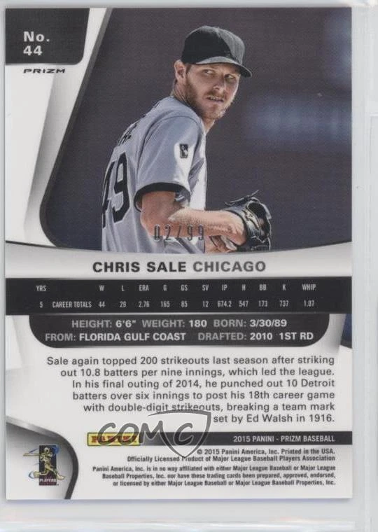 2015 Panini Prizm - [Base] - Purple Flash Prizm #44 Chris Sale Qty Made: 99 - Baseball Card - Featuring the Chicago White Sox - Featuring Chris Sale Search for more: 2015 Panini Prizm Search for more: 2015 Panini Prizm - [Base] - Purple Flash Prizm View all of our Listings Auctions Buy It Now About Us Located in the beautiful Pacific Northwest, COMC (Check Out My Cards) is the world's largest consignment service for trading card singles. More than 10,000 people have used our consignment service to list over 50 million trading cards. We currently house 20 million cards, each listed for sale with front and back images of the actual card. Find out how we can help you consign your items on eBay by contacting us through eBay messaging. COMC -- "The Safe & Easy Way to Buy & Sell" Representative Image - Select Specific Item above to see image of actual item Representative Image - Select Specific Item above to see image of actual item Raw Condition for Modern Cards Unless otherwise noted, raw modern cards are listed in Near Mint-Mint condition or better. A NM-MT card appears to be Mint at first glance, but upon closer inspection, may exhibit some of the following: minor print defects (e.g. roller marks, print line, dimple), minor scratches, slight edge wear, and slight corner wear. Centering is clearly visible in the images provided and does not factor into our condition assessment. Raw Condition for Vintage Cards Unless otherwise noted, raw vintage cards are listed in Excellent condition or better. An EX card may exhibit some of the following: minor rounding of corners, surface wear, print defects, light scratches, and slight edge wear/chipping. Centering is clearly visible in the images provided and does not factor into our condition assessment. Domestic Shipping Combined shipping for multiple items is available. To receive combined shipping, please ensure all desired items are in your eBay shopping cart before proceeding to checkout. eBay limits orders to 40 items per order. We automatically combine multiple orders placed on the same day. If you place multiple orders on the same day, please contact us to request a refund of applicable shipping costs. Signature confirmation may be required on invoices over $400. Raw cards are shipped in toploaders. International Shipping COMC offers eBay's International Shipping (EIS) for international orders under $2,500* (see country exceptions below). All duties and import fees are paid at checkout; in the rare event that there are additional import fees upon delivery, these are borne by the buyer. EIS packages route through a shipping hub in Erlanger, KY before shipping to their final destination. Please note that EIS does not allow for combined shipments. The shipping rates are determined by eBay and cannot be adjusted. *Maximum sale price exceptions: Colombia, Kuwait ($2,000); Taiwan ($1,539); Chile, Costa Rica, Guatemala, Honduras, Trinidad and Tobago ($1,000); Antigua and Barbuda, Aruba, Belize, Dominica, Grenada, Philippines, Saint Kitts and Nevis, Saint Lucia, Montserrat, Turks and Caicos Islands ($500); Dominican Republic, El Salvador ($200). Please request a shipping quote through eBay messaging for orders that exceed the maximum sale price supported by eBay's International Shipping. You will be responsible for all duties and import fees for international orders shipped outside the EIS. Raw cards are shipped in toploaders. Payment COMC does not accept offers on our cards through our eBay storefront. COMC utilizes eBay’s managed payments system. If you are experiencing difficulties making a payment, please contact eBay for assistance. Return Policy Returns are only accepted on the rare occasion the item is not as described. If you are making a return, please initiate the return process through eBay so a mailing label can be provided for you. Prior to listing, our expert team carefully assessed this item to represent it accurately. Please review the description and high-definition images prior to purchasing to ensure this item meets your satisfaction. We welcome you to contact us if you have further questions about this item. Trust and Integrity COMC carefully assesses each item consigned to us to prevent fraudulent items from entering the marketplace. If you believe an item offered on COMC may be fraudulent, please contact us with details so we can investigate the issue. Items we determine are outside our supported items policy may be removed. Last Modified: 12/25/2024 11:02:42 AM PDT