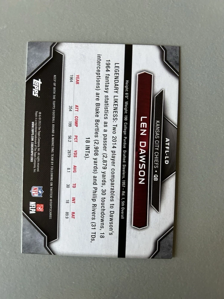 2015 Topps All-Time Fantasy Legends Len Dawson #ATFL-LD. Card is in mint condition. All items are shipped fast and secure. Combine shipping on 3 or more cards.