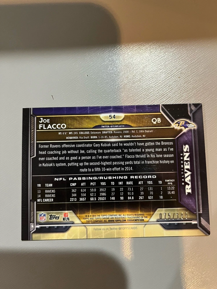 Really nice looking blue refractor of Joe Flacco of the Baltimore Ravens. Would be a great addition to any collection!