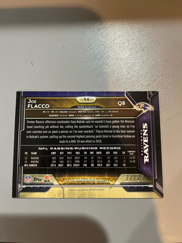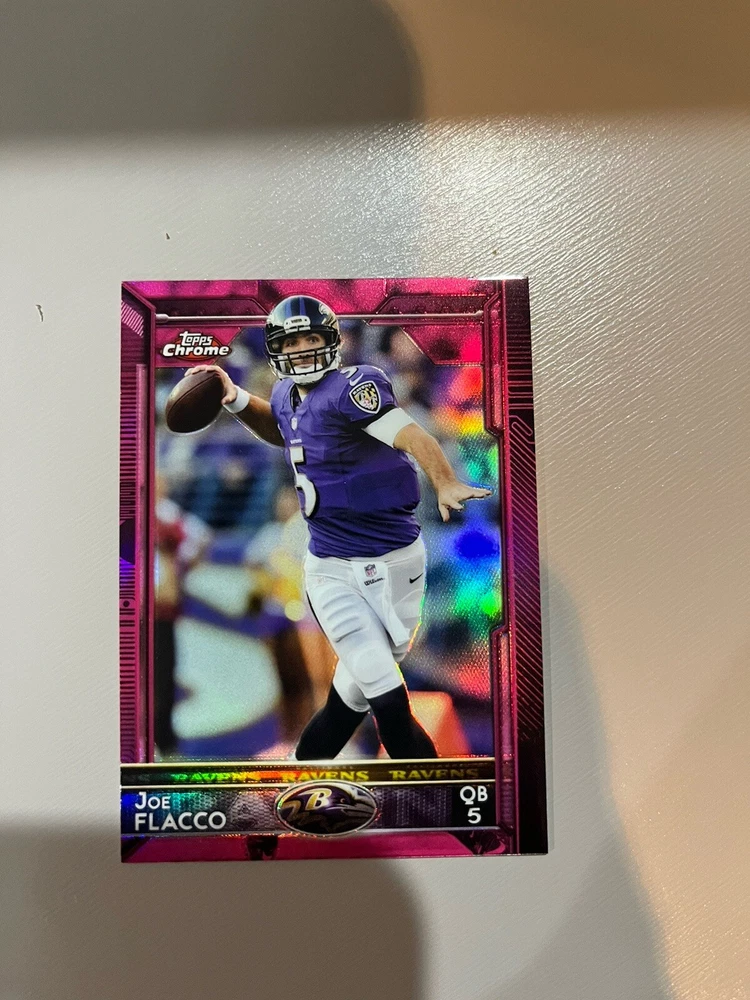 Franchise: Baltimore Ravens Original/Reprint: Original Card Name: Joe Flacco Year Manufactured: 2015 Athlete: Joe Flacco League: National Football League (NFL) Card Attributes: Serial Numbered Set: 2015 Topps Chrome Mini - [Base] - BCA Pink Refractor Team: Baltimore Ravens Card Manufacturer: Topps Parallel/Variety: BCA Pink Refractor Features: Parallel/Variety, Serial Numbered, Short Print, Limited Edition, Hologram Year: 2015 Season: 2015 Manufacturer: Topps Card Number: 54 Player/Athlete: Joe Flacco Sport: Football Type: Sports Trading Card Print Run: 25 Player: Joe Flacco Product: Single-Parallel Autographed: No