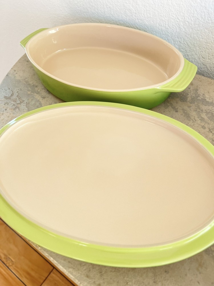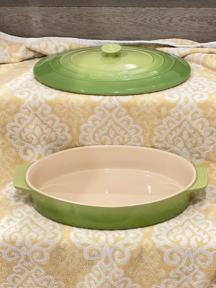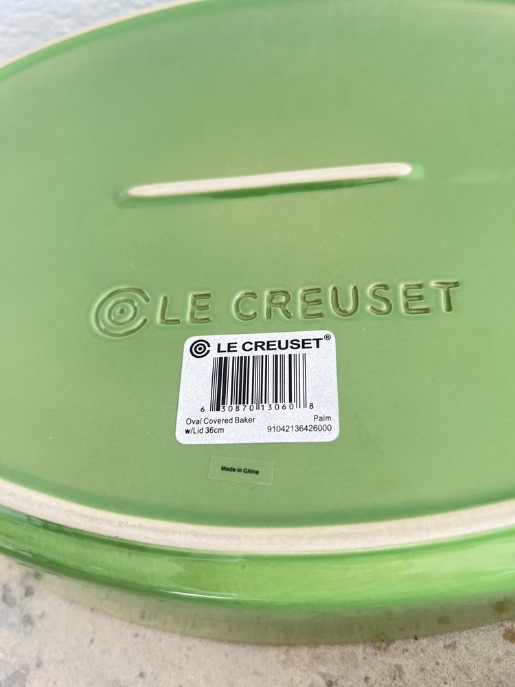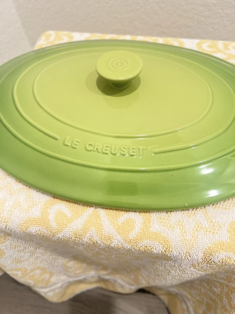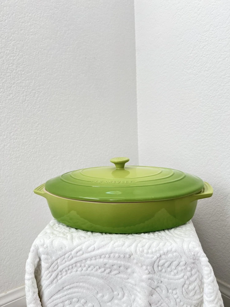 The vintage 2015 36cm Le Creuset Plam Kiwi Green color oval covered baker with lid is a two-piece set that includes a ceramic surface coating made of enamel and stone. It is compatible with induction, gas, and electric stove types and has a unique oval shape. Preowned never used no original packaging