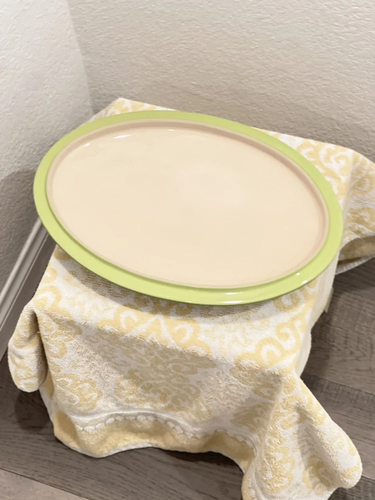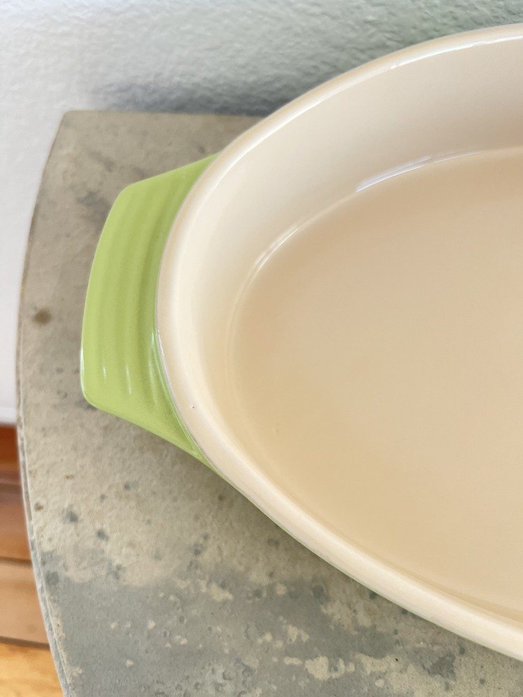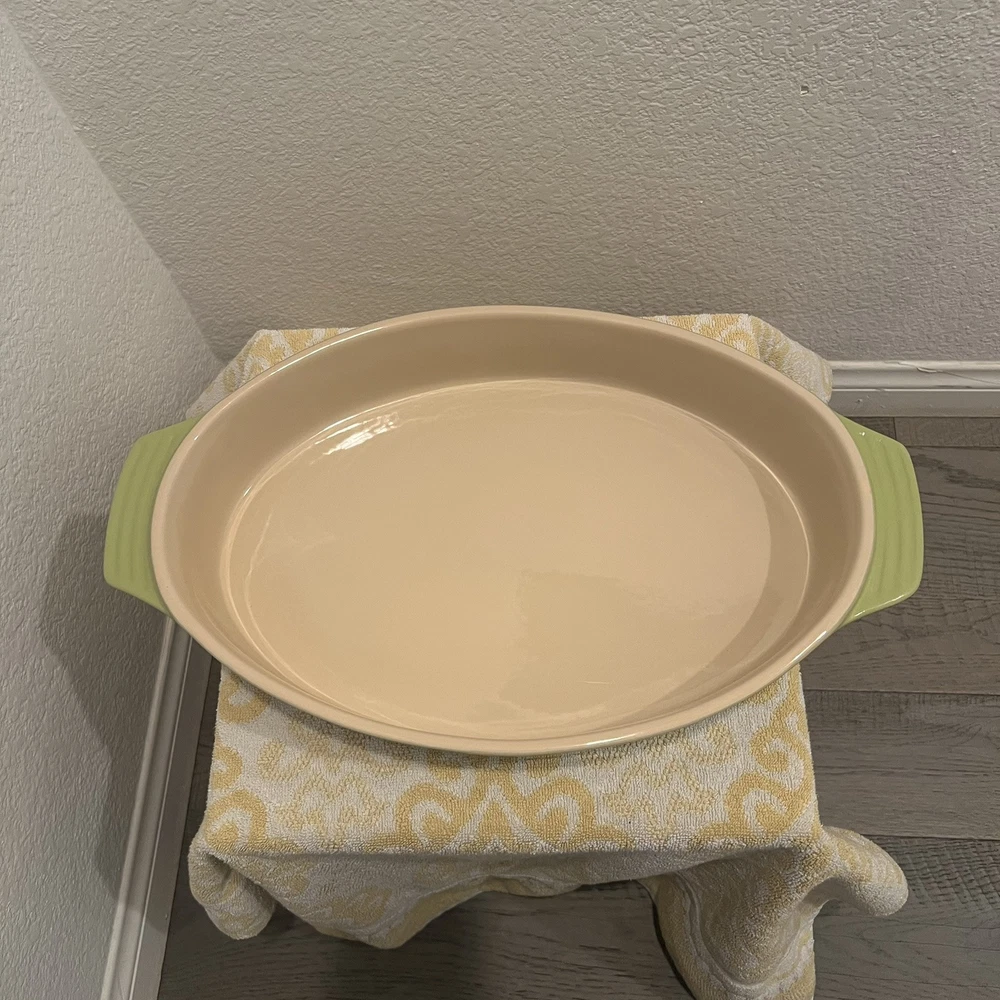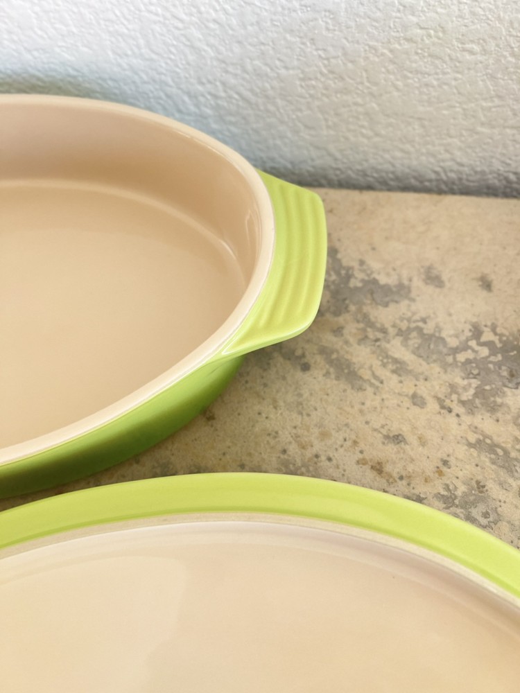 The vintage 2015 36cm Le Creuset Plam Kiwi Green color oval covered baker with lid is a two-piece set that includes a ceramic surface coating made of enamel and stone. It is compatible with induction, gas, and electric stove types and has a unique oval shape. Preowned never used no original packaging