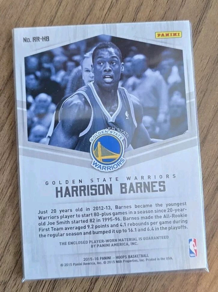 The product is a 2015-16 Hoops Basketball trading card featuring Harrison Barnes of the Golden State Warriors. It is a Rookie Remembrance Memorabilia card, with a piece of Barnes' jersey embedded in the card. The card is in Near Mint/Mint condition and is an original release by Panini Group. It is card number 17 in the set and is part of the 2015-16 basketball season.
