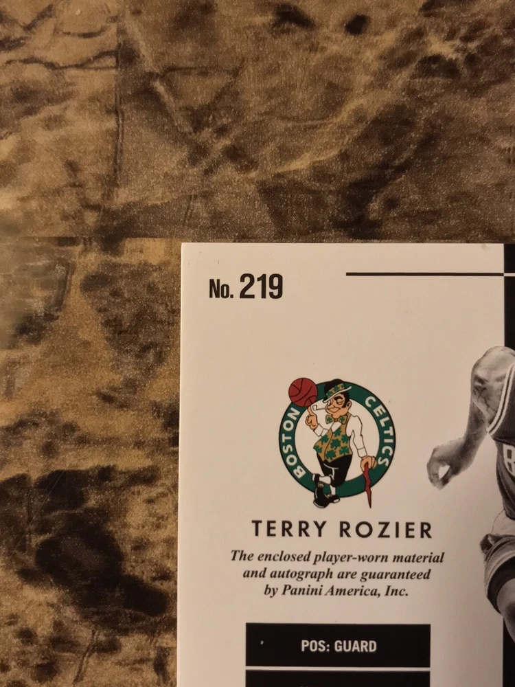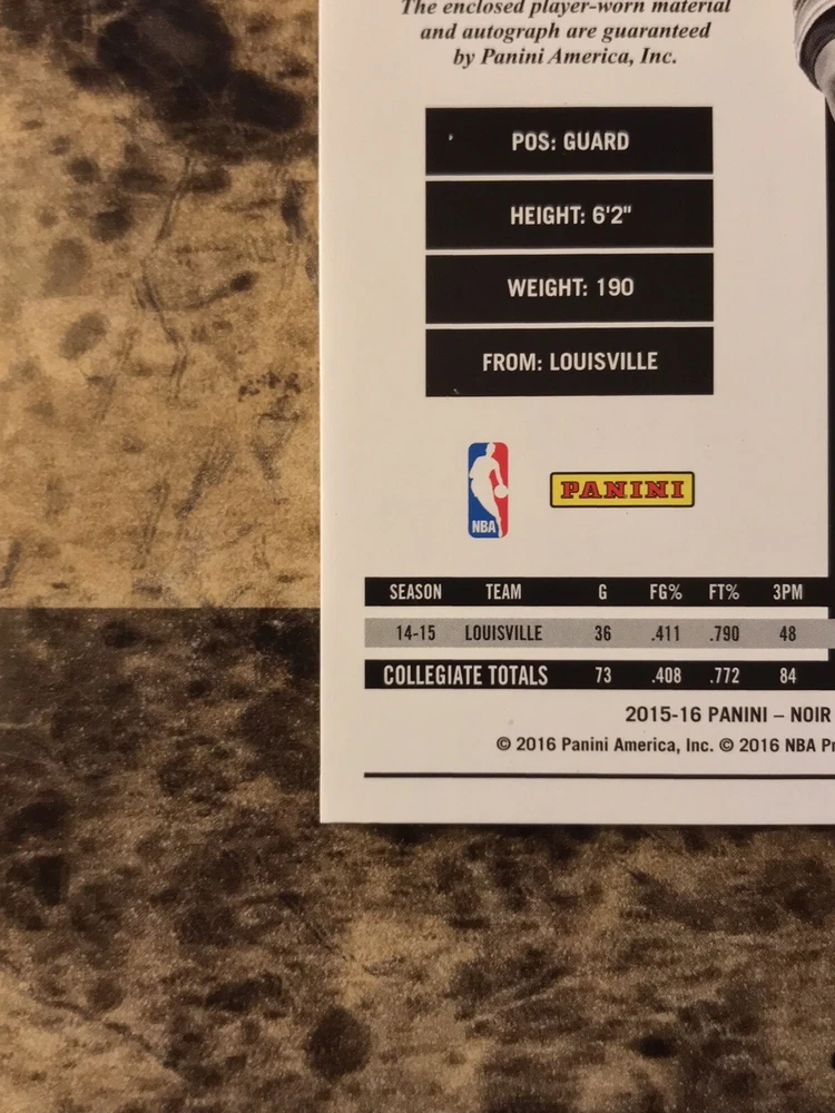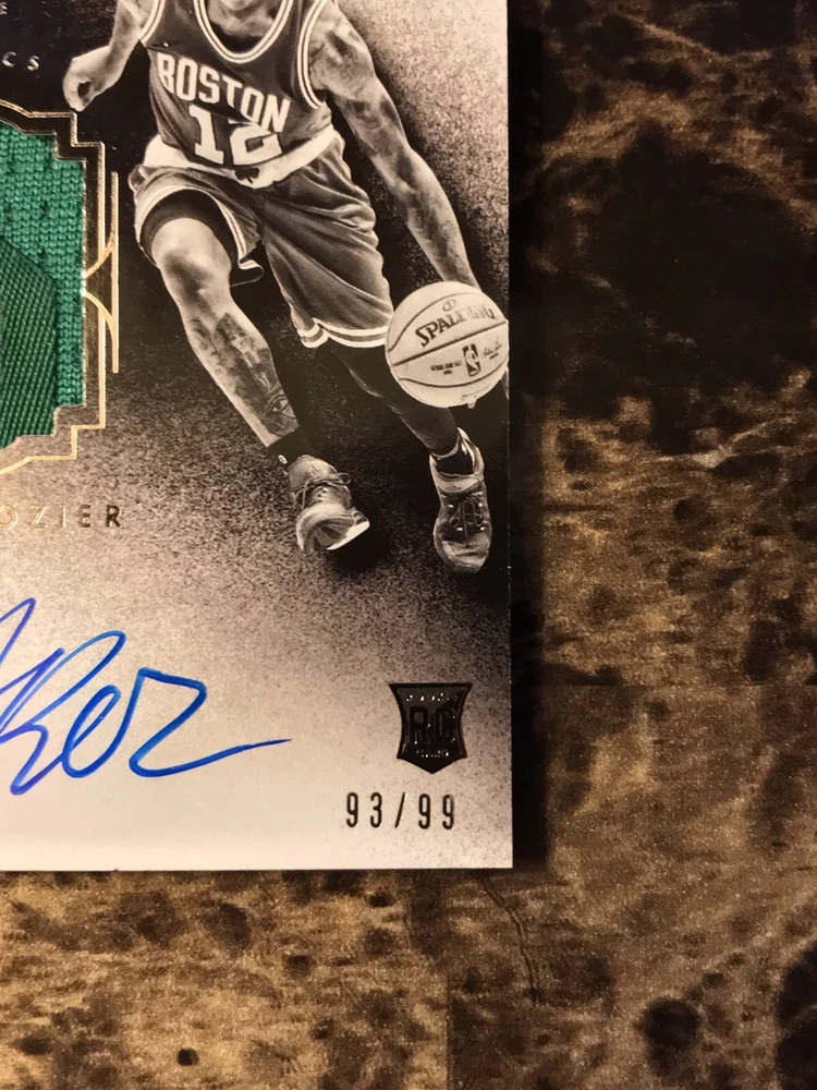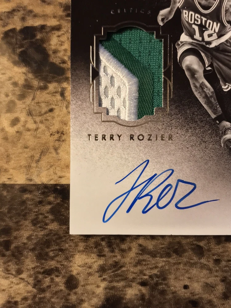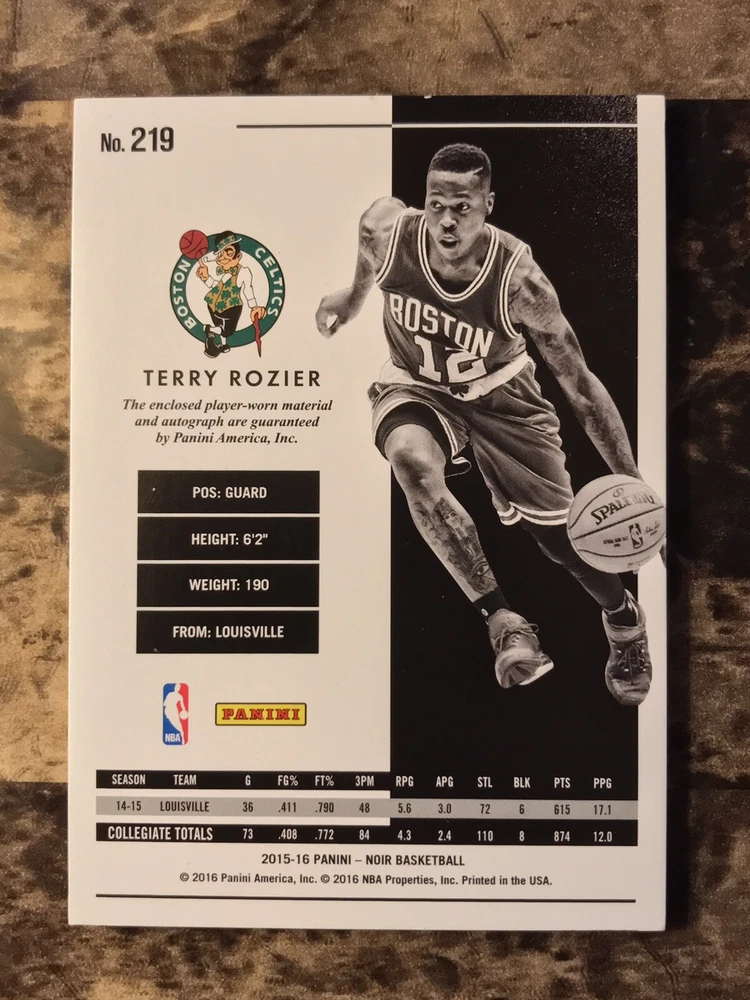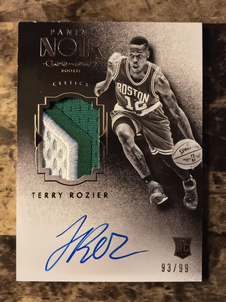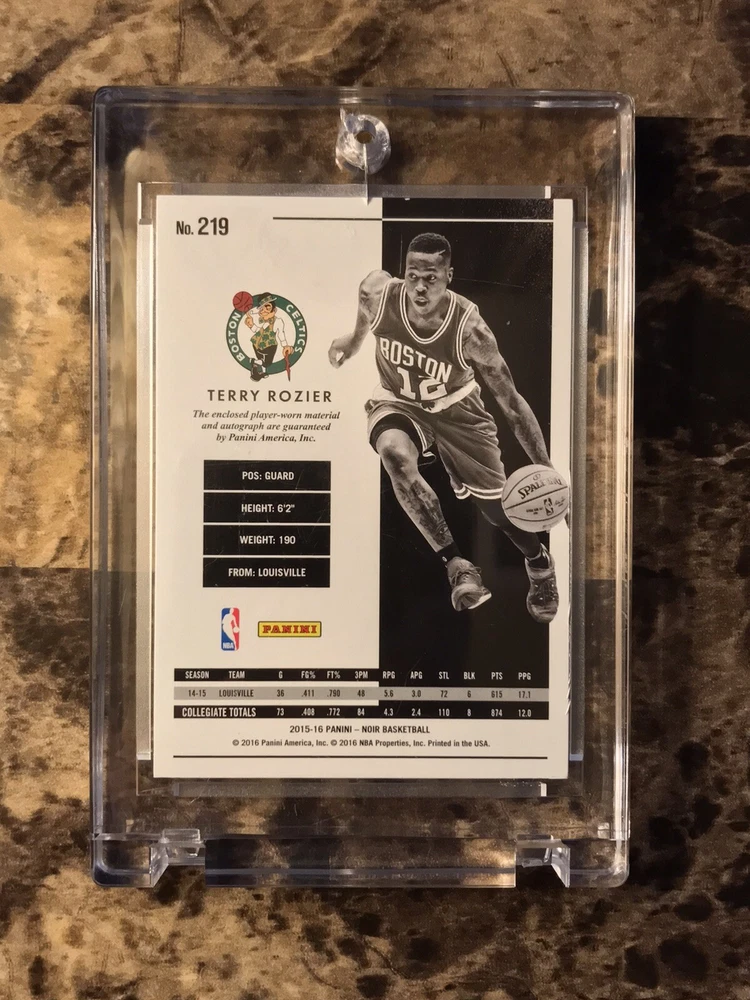 Player/Athlete:Terry RozierSeries:Panini NoirSubset:Auto Patch Black and White RookiesPrint Run:99Manufacturer:PaniniSet:2015-16 Panini NoirCard Number:219Sport:BasketballLeague:National Basketball Association (NBA)Team:Boston CelticsSeason:2015-16Features:Serial Numbered, Base Set, Rookie, MemorabiliaAutographed:Yesbrand:PaniniAdditional Description:Auto Patch Black and White Rookies - Terry Rozier