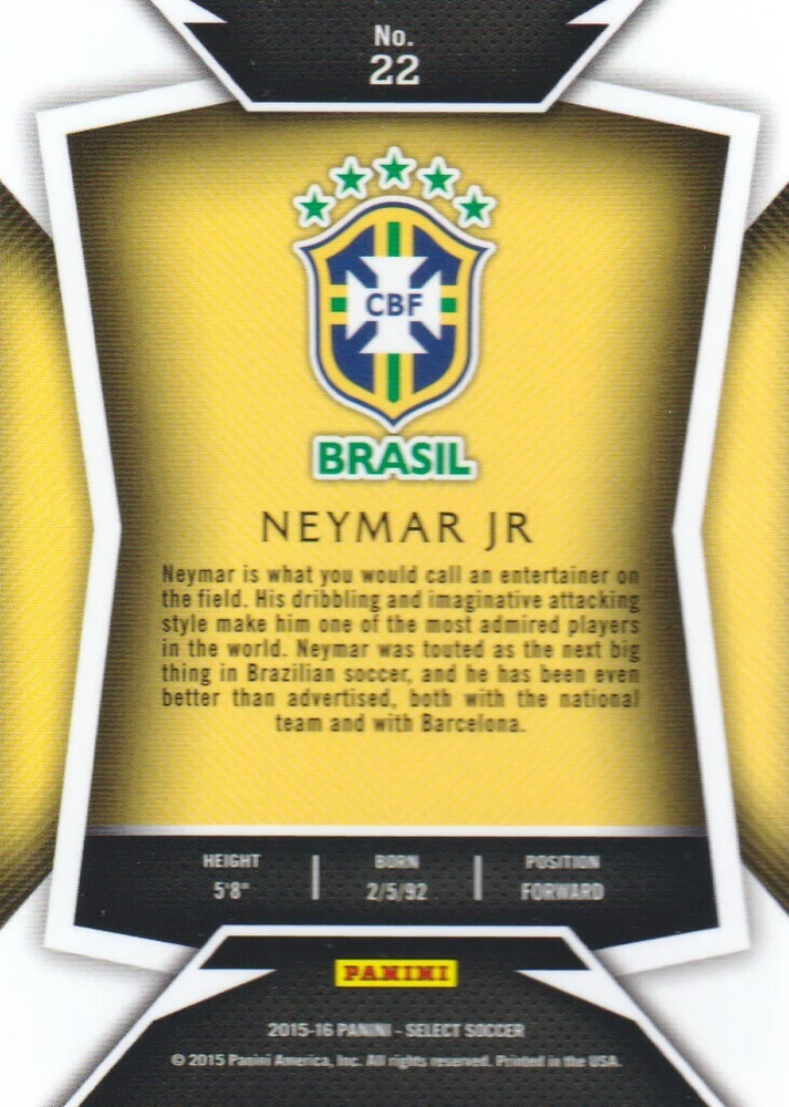 *** PLEASE READ *** Our Shipping Policy - Single Cards Only USA Orders (Including Hawaii, Alaska, Puerto Rico & all US Territories) Pay one FLAT SHIPPING FEE regardless of how many single cards you buy. We offer combined shipping when you buy multiple items. Please add the items you wish to purchase to eBay's shopping cart to get our combined shipping offer & qualify for one of our promotions. All qualifying promotions & offers are automatically applied during checkout by eBay. We cannot combine multiple orders once payment is completed. Please be sure to read our promotions & offers carefully to qualify. International Orders (Including Canada, Europe, Asia & Australia) Pay one FLAT SHIPPING FEE regardless of how many single cards you buy. We offer combined shipping when you buy multiple items . Please add the items you wish to purchase to eBay's shopping cart to get our combined shipping offer & qualify for one of our promotions. We cannot combine multiple orders once payment is completed. We reserve the right to refuse shipments to certain countries. Please contact us if you have any questions or concerns. Payment Information & Terms of Sale We accept PayPal & all major credit cards offered through eBay checkout. Orders are shipped within 24 hours of payment, or the next business day if payment is made on Saturday, Sunday or a Holiday. We ship Worldwide! 2015-16 Panini Select Soccer Trading Card #22 Neymar Jr. Front Back Sport: Soccer Set: 2015-16 Select Year: 2015 Item#: 22 Player: Neymar Brand: Select Manufacturer: Panini Group Grading Company: Raw Grade SetType: Main Item Condition: Near Mint/Mint 2014 Beckett Collectibles, LLC. All Rights Reserved Powered by: About Us We have been eBay Sellers since 1998. Our feedback is solid, so please purchase with confidence! We leave feedback on all transactions once payment has been completed. Please contact us if you experience any problems or issues with your order.