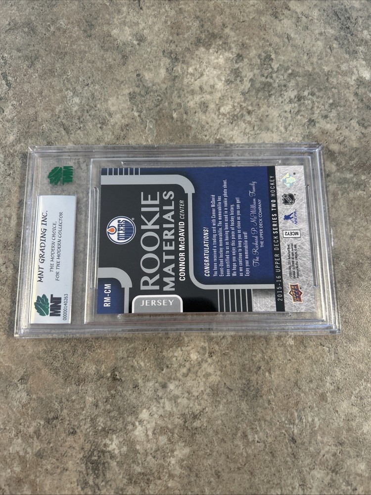 Capture a piece of ice hockey history with the 2015-16 Upper Deck Series 2 Connor McDavid Rookie Materials Jersey Patch card. Featuring the iconic Edmonton Oilers captain in his inaugural season, this card is a must-have for fans and collectors alike. The Rookie Materials Jersey Patch card is a testament to McDavid's early promise, showcasing his potential during his sensational rookie campaign. Crafted by Upper Deck, a trusted name in sports memorabilia, this card is part of a set known for quality and authenticity. Without an autograph, the focus remains purely on the raw talent and legacy of one of hockey's most exciting prospects. Whether for display or as a treasured addition to your collection, this card celebrates the legacy of a true ice hockey phenom. Graded and slabbed. Thick cards don't usually get high grades. Tracked shipping to USA/Canada.