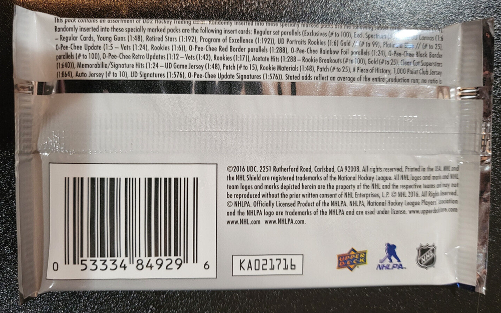Year Manufactured: 2016 Sport: Ice Hockey Season: 2015-16 Country of Origin: United States gtin13: 053334849296 Vintage: No Autograph Authentication: Upper Deck Configuration: Pack Number of Cards: 8 Features: Base Set, Insert, Parallel, Rookie, Serial Numbered, Short Print Number of Packs: 1 Material: Card Stock Language: English UPC: 053334849296 Manufacturer: Upper Deck Card Size: Standard Player/Athlete: Assorted Players Set: 2015-16 Upper Deck Team: Assorted Teams League: National Hockey League (NHL) Type: Sports Trading Card